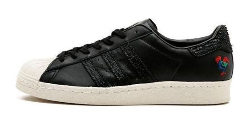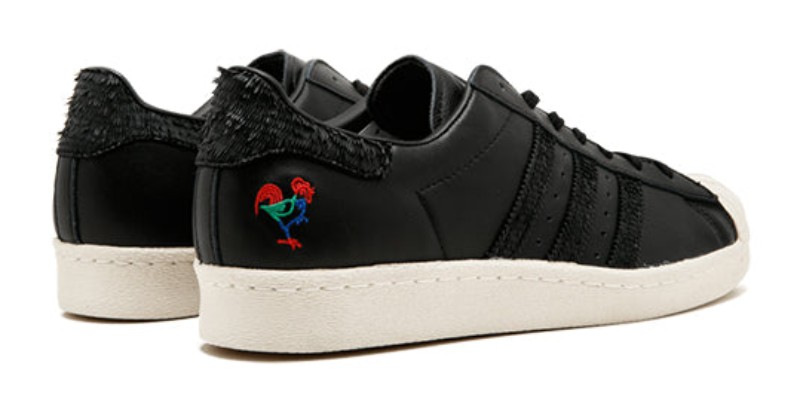 This shoe features an upper constructed primarily of Core Black leather. The colorway is designed to celebrate the Chinese Year of the Rooster (2017). It contrasts the dark upper with a Chalk White shell toe and outsole. The most distinct feature is the vibrant, multicolored embroidered rooster graphic on the heel, and the heel tab is detailed with a textured, feathered leather for a unique touch.