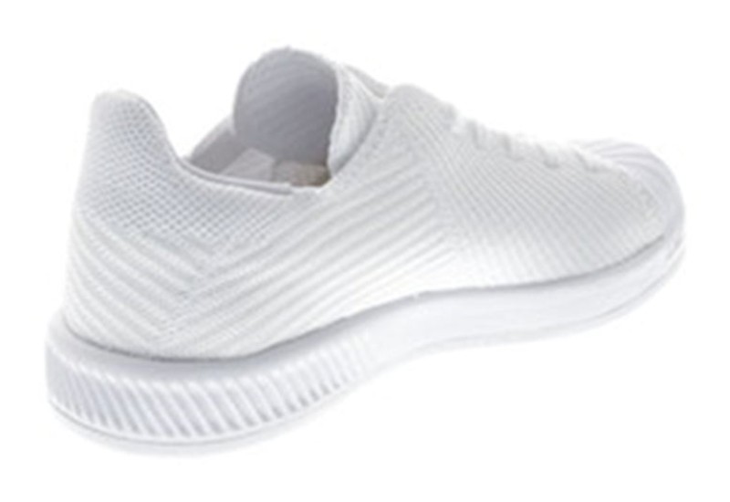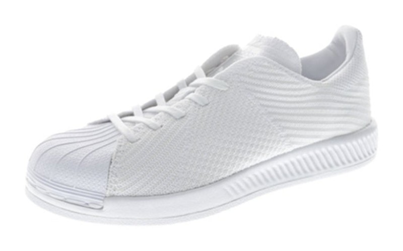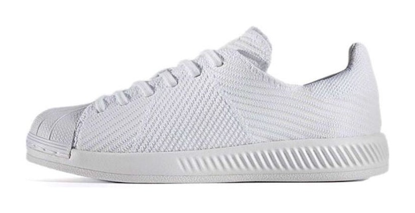 This shoe provides a modern upgrade to the classic Superstar silhouette. It features a completely monochromatic "Triple White" aesthetic, with the upper constructed from flexible, sock-like Primeknit material instead of traditional leather. The midsole uses Bounce cushioning for lightweight comfort. It retains the signature rubber shell toe, also in white, creating a clean, seamless, and futuristic look.