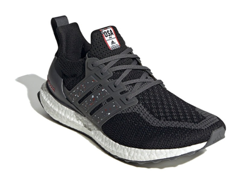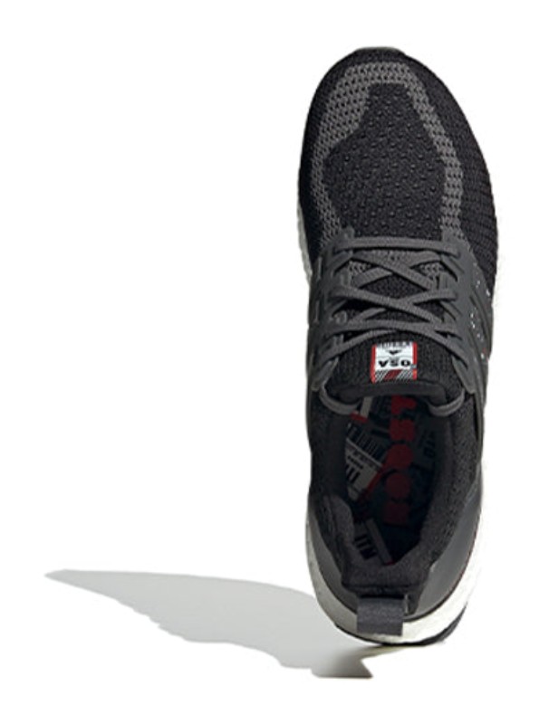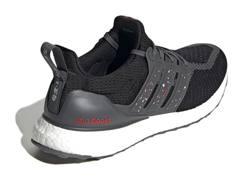 This is the Osaka edition from the Ultra Boost City Pack. It features a Primeknit upper in a blend of "Core Black" and "Grey Six," giving it a dark, versatile base. A vibrant "Red" is used for key accents on the Three Stripes, which contrasts sharply with the dark upper. The shoe is grounded by the iconic white Boost midsole for comfortable cushioning and an outsole featuring a combination of grey and red.