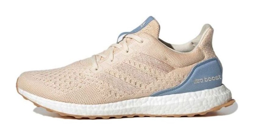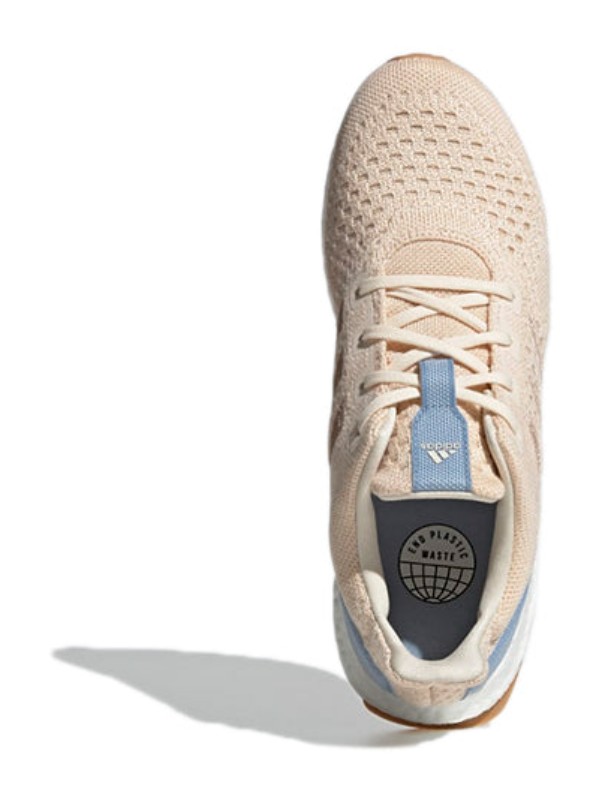 This model is an experimental (LAB) take on the popular UltraBoost Uncaged silhouette, built with a focus on sustainable materials. It features a seamless Primeknit textile upper in a neutral "Wonder White" with subtle woven accents of "Halo Blush" (a soft pink/beige) and Ambient Sky (a light blue), which is made in part with TENCEL™ fibers. The "Uncaged" design removes the traditional midfoot cage for a minimalist, sock-like fit. It sits on a full-length BOOST midsole for responsive cushioning and high energy return, suitable for both running and lifestyle wear.