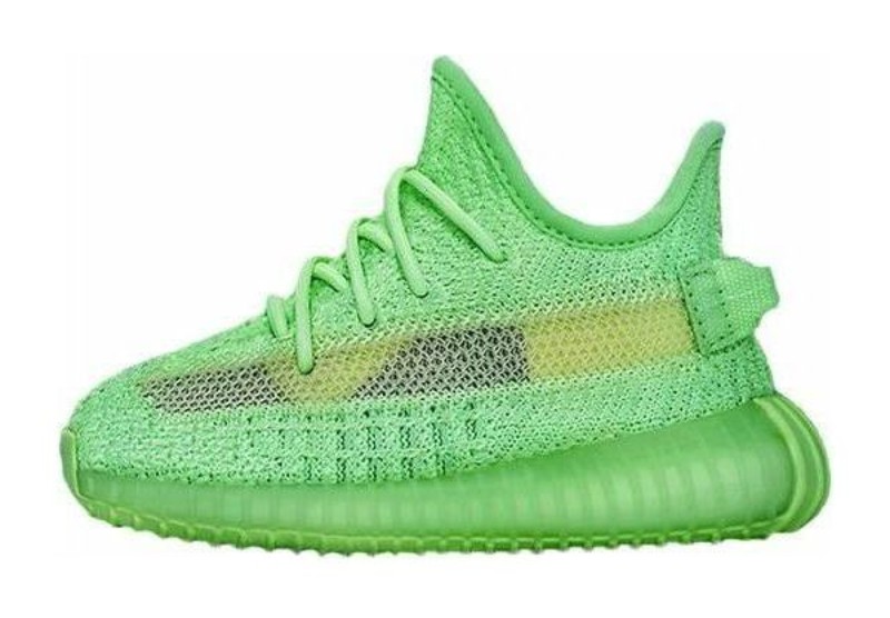 This infant-sized sneaker mirrors the adult version in its vibrant, monochromatic fluorescent green color across the entire shoe. It features a Primeknit upper, translucent side stripe, and a thick ribbed outsole and midsole. The defining feature is the "Glow-in-the-Dark" finish on the whole shoe, allowing it to brightly illuminate in dark environments.