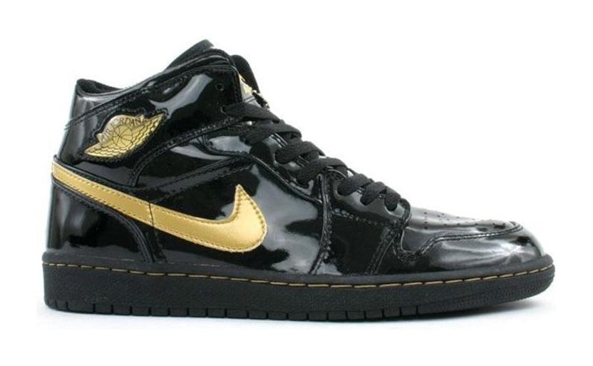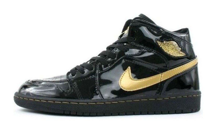 This sneaker is a retro release from 2003, distinguishing itself with an entirely Black patent leather upper, giving the classic Air Jordan 1 silhouette a sleek, glossy, and luxurious appearance. Metallic Gold accents are strategically used to create contrast and a premium feel. These gold hits appear on the Nike Swoosh, the Air Jordan "Wings" logo stamped on the collar, and the Jumpman branding on the tongue tag. The black midsole features subtle, contrasting gold stitching, and the shoe sits atop a black outsole. The combination of black patent leather and metallic gold is often associated with early, high-end Air Jordan releases.