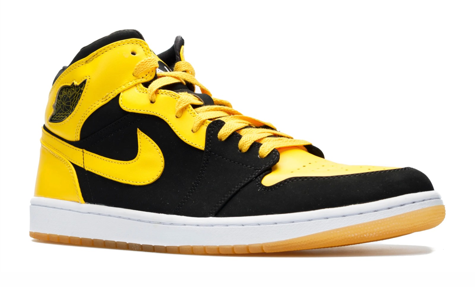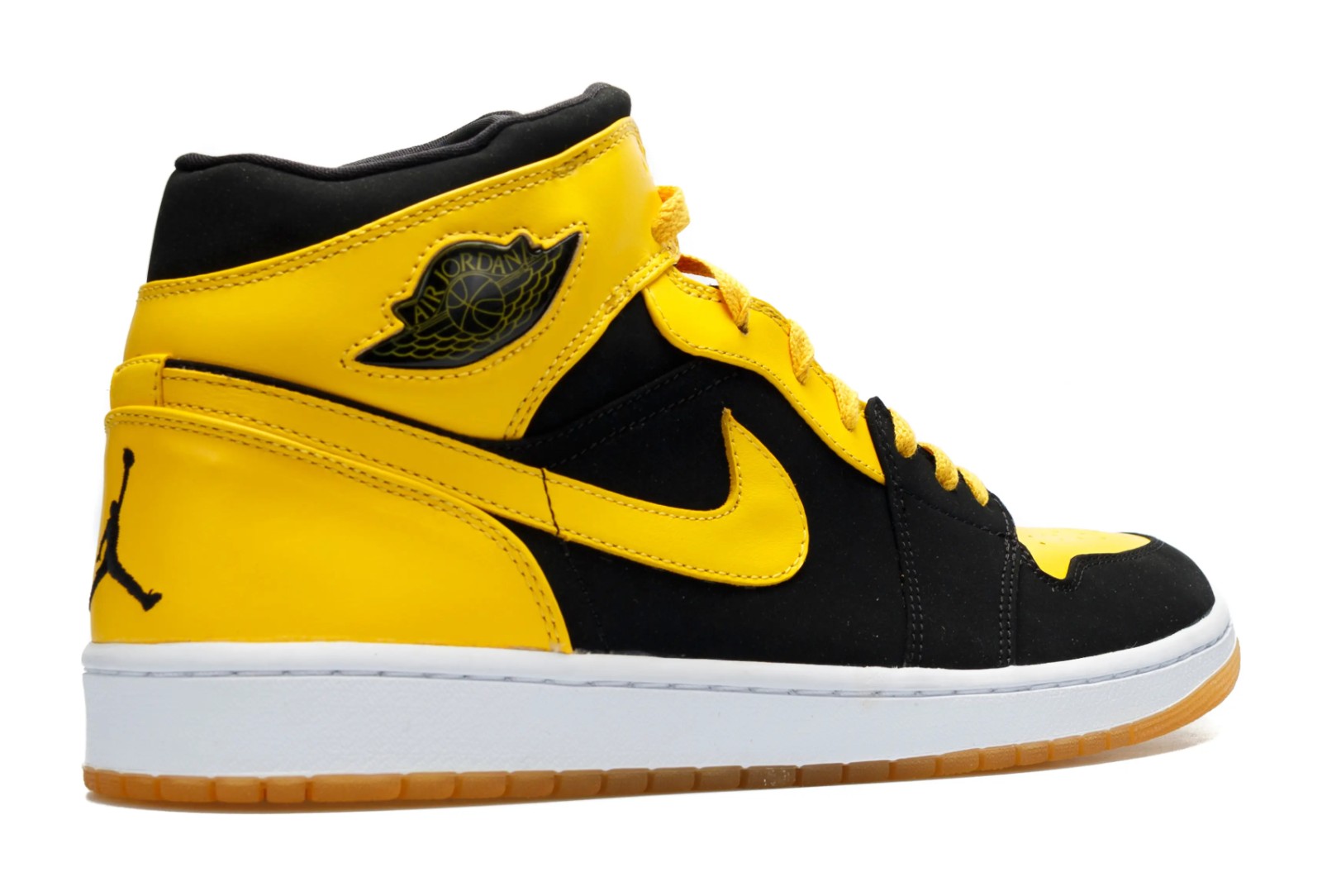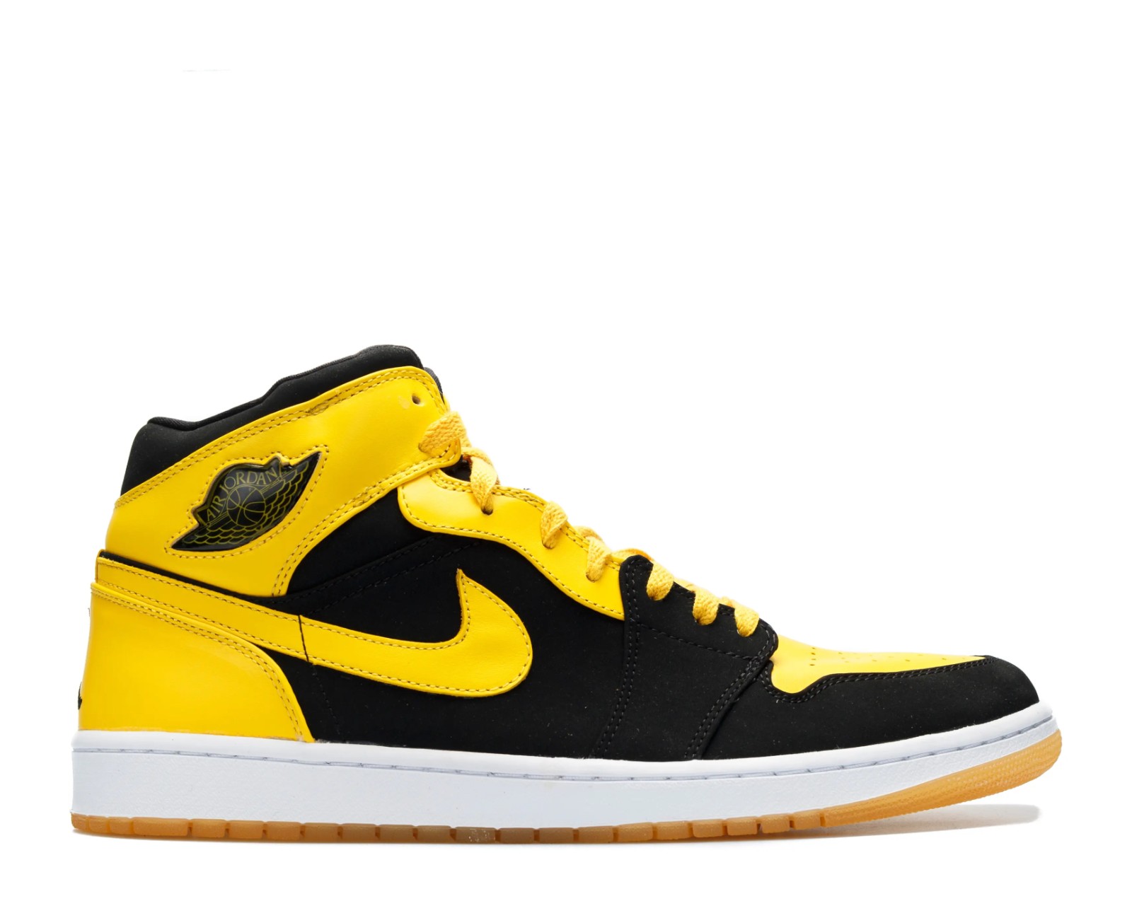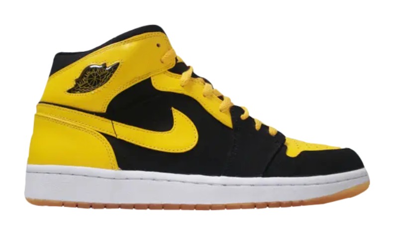 The "New Love" was released as one half of the "Beginning Moments Pack (BMP)" and represents Michael Jordan's passion for motorsport, specifically his racing team, Jordan Motorsports, whose official colors are Black and Varsity Maize. The shoe is a mid-top silhouette featuring a predominantly Black leather and nubuck upper. The overlays, including the toe box, ankle collar, and Swoosh outline, are in a vibrant Varsity Maize (yellow). Unique features include a White midsole for contrast, a partially translucent outsole, a jewel-style Wings logo on the ankle collar, and Jumpman branding on the tongue and heel, instead of the original "Nike Air" and "Wings" logo.