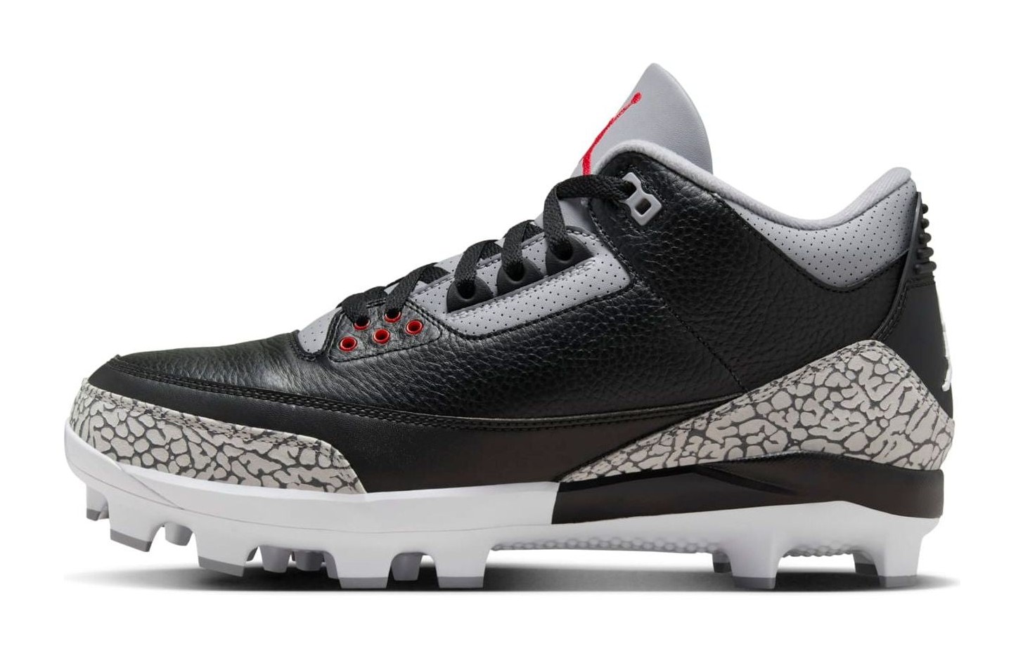 The Air Jordan 3 Retro MCS Cleat 'Black Cement' is a men's athletic cleat, borrowing the design and color scheme from the classic Air Jordan 3 sneaker. The cleat is constructed with a Black tumbled leather upper and the iconic Cement Grey elephant print wrapping around the toe and heel. Fire Red accents highlight the Jumpman logo embroidered on the tongue and are used for the round eyelets. The shoe is adapted for the field with a molded cleated outsole for traction in sports like baseball or football. The cleat maintains the mid-top silhouette and overall aesthetics of the Air Jordan 3, replacing the traditional rubber cup sole with a functional cleat plate.
