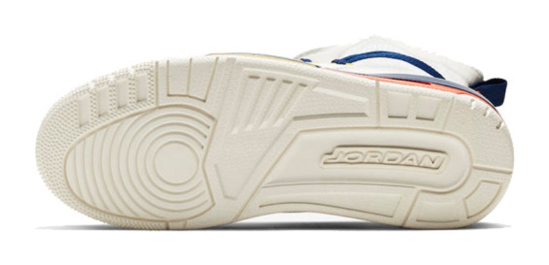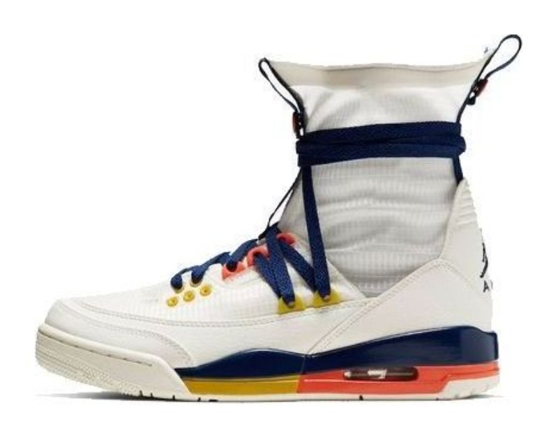 The Air Jordan 3 Retro Explorer Lite XX 'Sail Multi-Color' (Women's) is a fashion-forward, women's-exclusive model that radically reworks the Air Jordan 3 into a high-cut, utility-inspired silhouette. The upper is mainly constructed in Sail (off-white) textile with leather overlays, providing a clean canvas for the bright accents. This iteration features an ultra-high ripstop collar that extends above the ankle, and a unique, colorful rope lacing system that wraps around the shaft with added button clasps. The 'Multi-Color' element comes from the vibrant pops of Blue Void (navy/dark blue), Turf Orange, and Bright Citron (yellow) visible on the eyestays, outsole, and various design elements, giving the explorer-themed shoe a noticeable contrast. It retains the traditional Air-cushioned midsole unit from the original AJ3.
