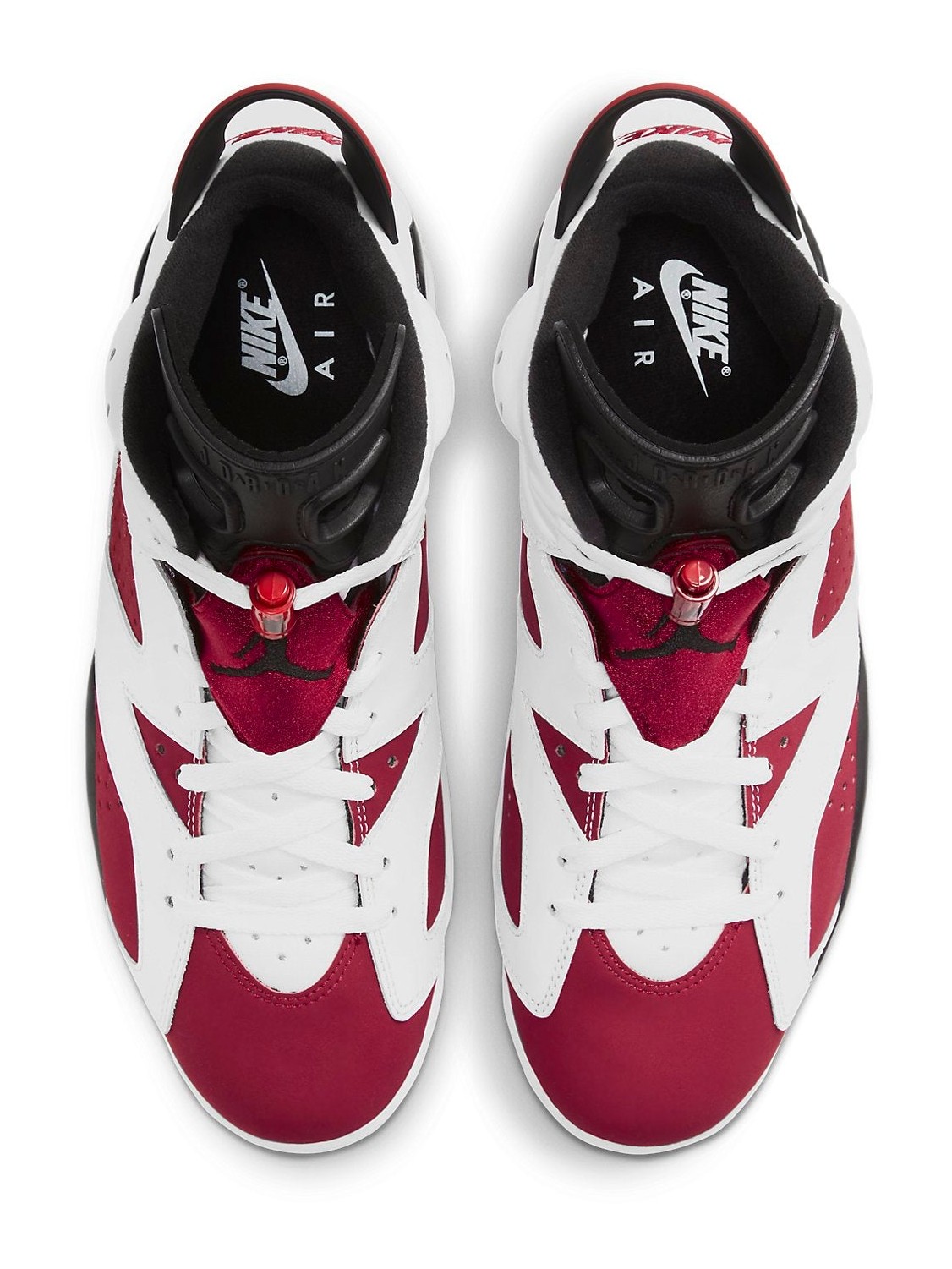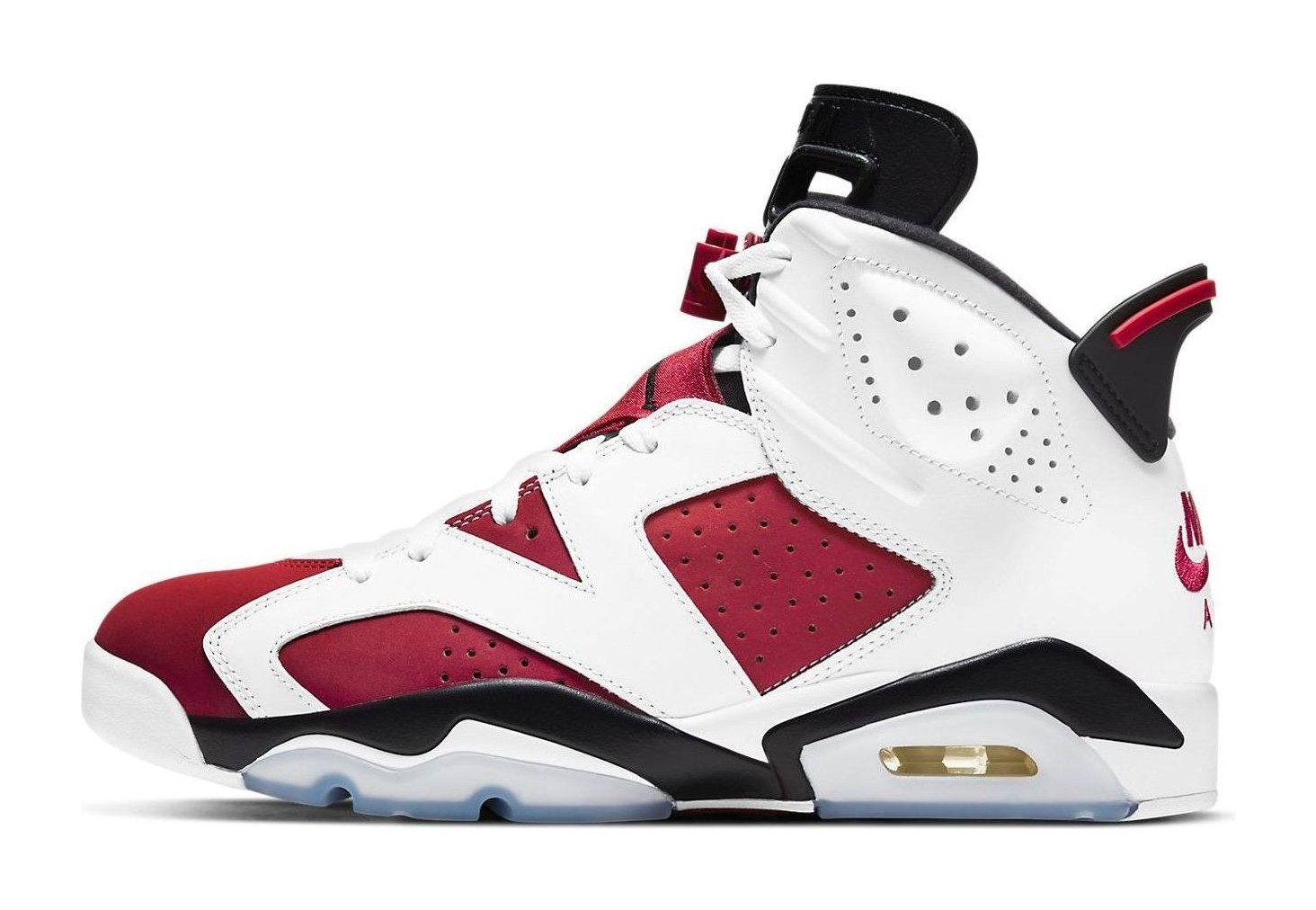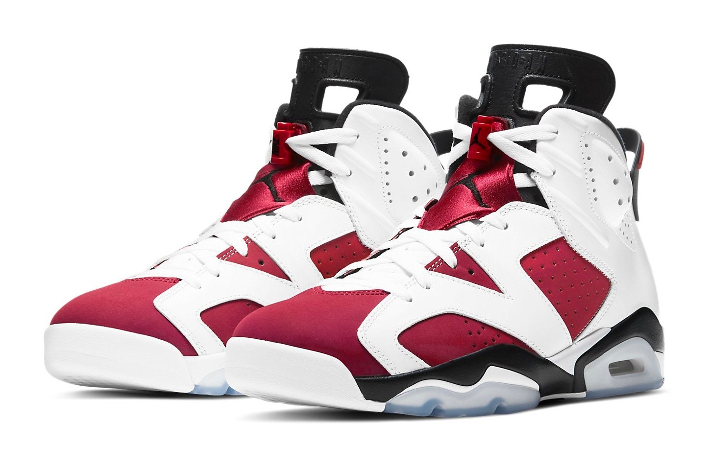 The Air Jordan 6 Retro OG "Carmine" is a highly coveted original colorway first released in 1991, the year Michael Jordan won his first NBA Championship. The 2021 Retro is particularly significant as it marks the return of the original "Nike Air" branding on the heel. The sneaker features a bold, two-tone upper with Carmine red nubuck panels overlaid with crisp white leather. Black accents are found on the tongue, lace lock, heel tab, and midsole, with a translucent, icy-blue outsole completing the iconic design. The striking color blocking instantly ties the shoe to the Chicago Bulls' team colors.