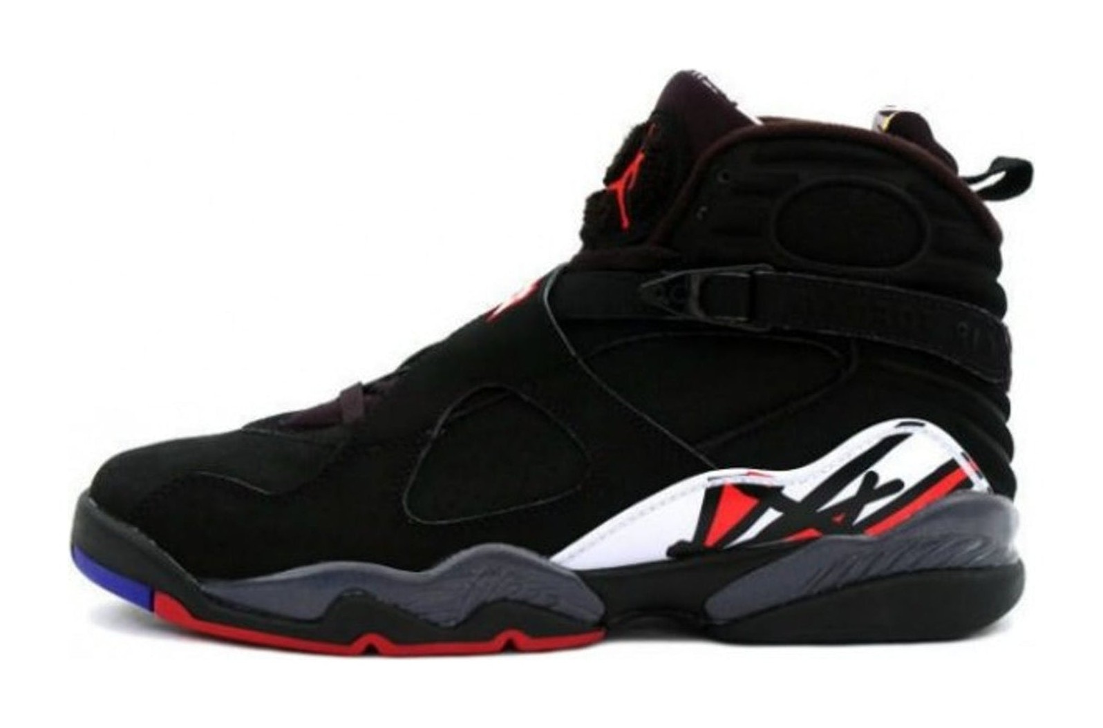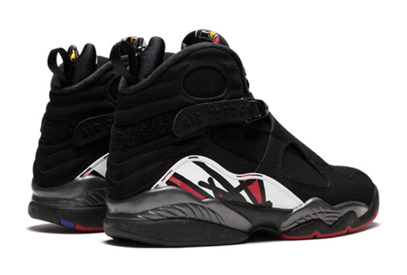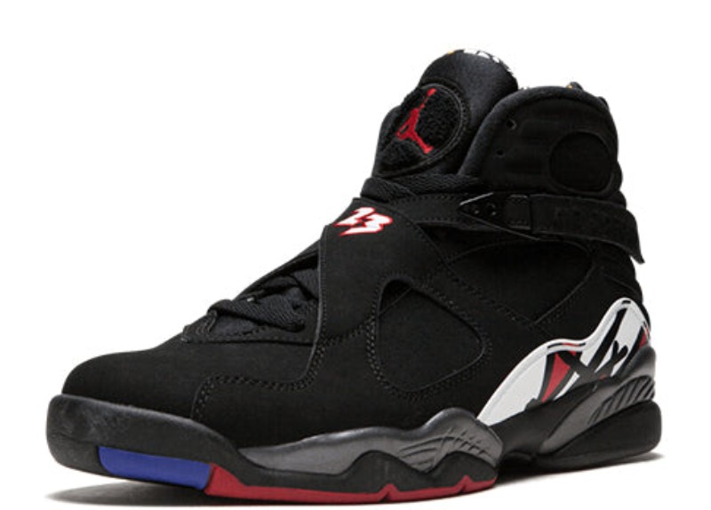 This is the 2013 retro release of the iconic "Playoffs" colorway, famously worn by Michael Jordan during the 1993 NBA Finals against the Phoenix Suns, where he secured his first "three-peat" championship. The shoe features a nearly all-Black nubuck and leather upper, a white and True Red patterned graphic on the heel and midsole, and a multicolored circular chenille Jumpman logo on the tongue that includes accents of Bright Concord. The criss-cross straps, signature to the Air Jordan 8, are also black. This colorway is distinguished by its predominantly black and red theme, giving it a classic Chicago Bulls aesthetic.