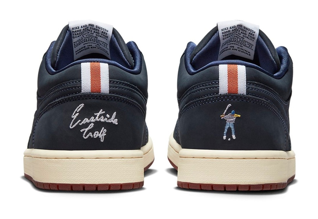 This collaboration with the lifestyle golf brand Eastside Golf is a special version of the Air Jordan 1 Low designed with a spikeless outsole for on-course wear. The upper is constructed entirely from premium Midnight Navy nubuck, giving it a rich, luxurious look. The shoe features special detailing, including metallic gold lace tips for a premium accent and co-branding on the tongue and insole. The midsole is White or cream-colored, providing contrast, while the outsole, which symbolizes the "mud" referenced in the nickname, is a blend of Redstone and other dark tones to mimic red clay. The overall message of the collaboration is "Out of the clay, into the future," a nod to overcoming adversity.