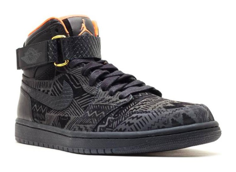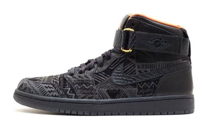 This highly exclusive sneaker was a charitable release for Black History Month (BHM) 2013, designed in collaboration with streetwear designer Don C (Just Don). The shoe utilizes the Air Jordan 1 High Strap silhouette. The upper is made of Black leather, which is accented with various tonal textile prints and panels, signifying the BHM theme. A luxurious touch is added with embossed snakeskin detailing on both the ankle strap and the cut-out Swoosh logo. The all-black exterior is contrasted by a vibrant Orange leather inner lining for a pop of color, and the interior of the tongue features embroidered "BHM" lettering. The model features a removable ankle strap and an Air-Sole unit for cushioning.