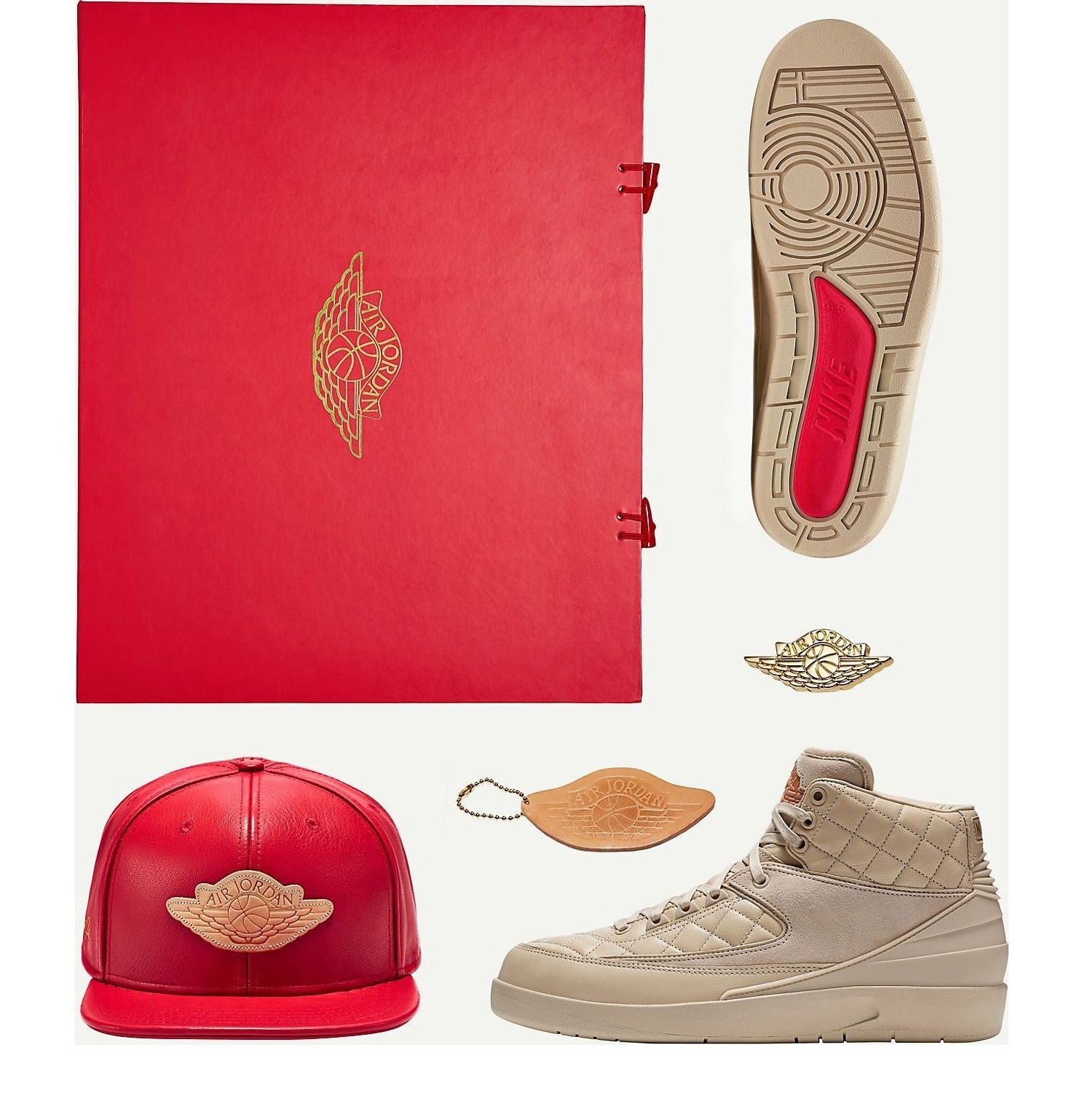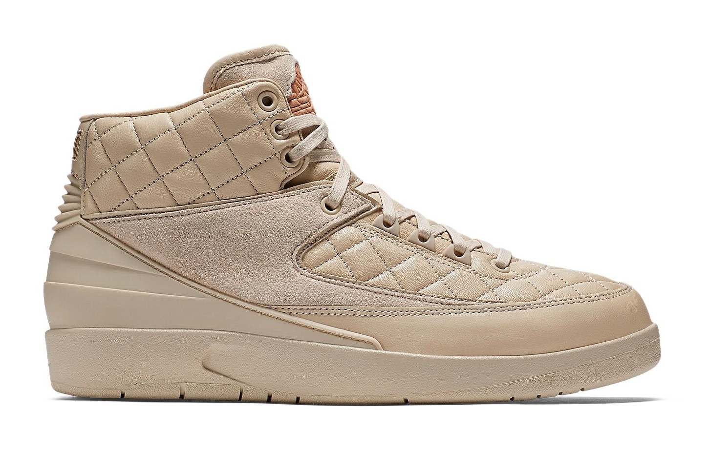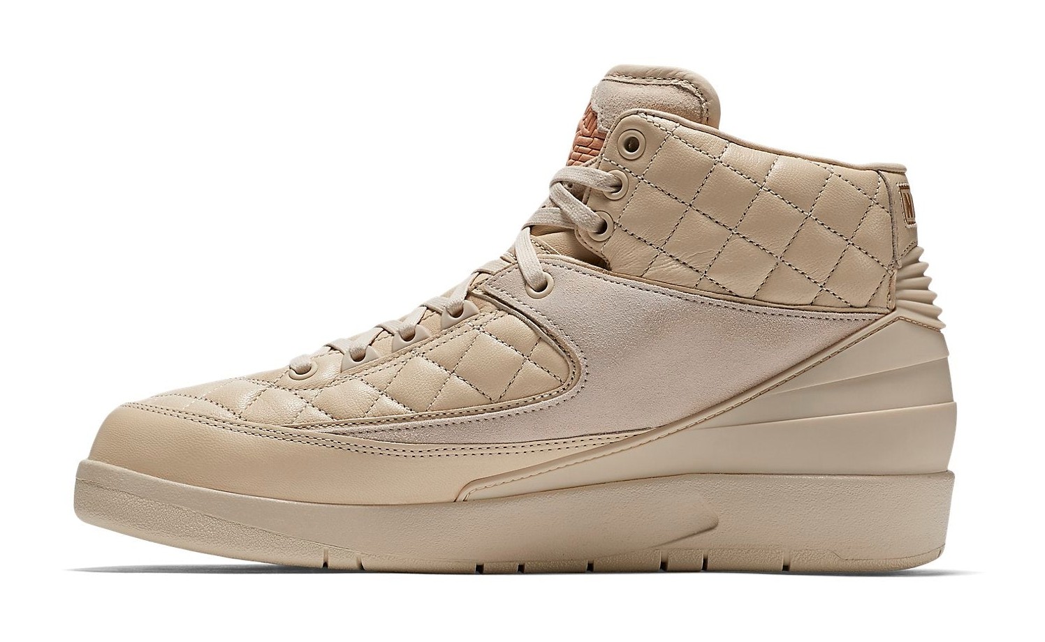 The third colorway in the coveted Just Don x Air Jordan 2 series (after "Royal Blue" and "Beach"), this model is presented in a luxurious, monochromatic "Beach" color, a soft, pale tan/cream hue. The shoe features premium quilted leather paneling on the collar and midfoot, with tonal suede accents, offering a high-end, lifestyle feel. Metallic Gold details are used for the lace tips and the shoe's branding elements, including the Air Jordan Wings logo on the tongue, while a minor touch of University Red is often found on the insole branding. This release was famously packaged with a matching Just Don x Jordan hat.