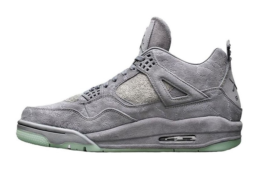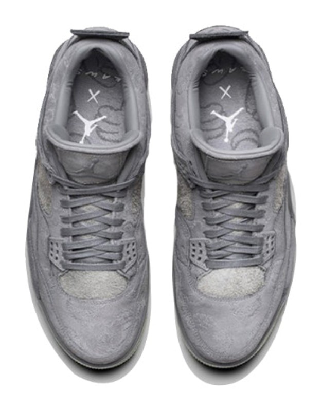 This was the first highly-anticipated collaboration between Jordan Brand and renowned artist KAWS (Brian Donnelly). It features a tonal Cool Grey premium suede upper, replacing the traditional netting and plastic wings with matching suede for a luxurious finish. The suede material is subtly embossed with a pattern of KAWS's signature "Companion" figure's hands. Key branding includes the artist's "XX" logo on the translucent, glow-in-the-dark outsole, which also allows a view of the hand graphic underneath. The shoe was released with special co-branded packaging and accessories.