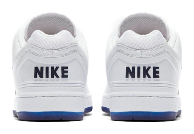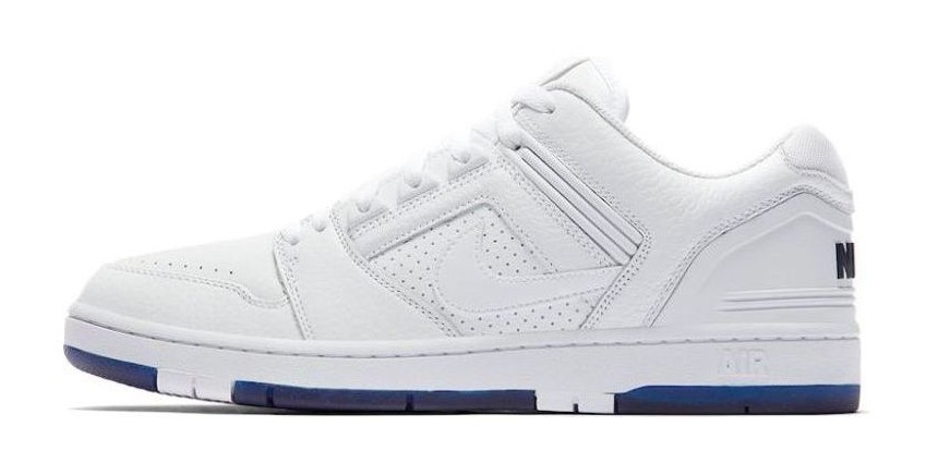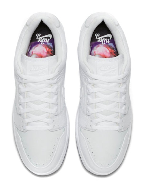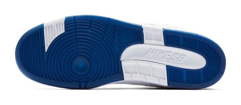 This collaboration with professional skater Kevin Bradley features a clean, white, skate-ready construction that conceals a hidden detail. The upper is made of premium White leather designed to wear away over time and with skating, revealing a bright Blue Void lining underneath, which is also foreshadowed by the translucent blue rubber outsole. Unique features include an illustration of Bradley's dog, Jericho, stamped onto the sockliner, paying homage to the skater's love for animals.