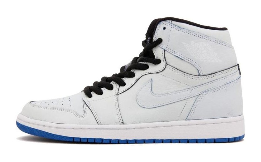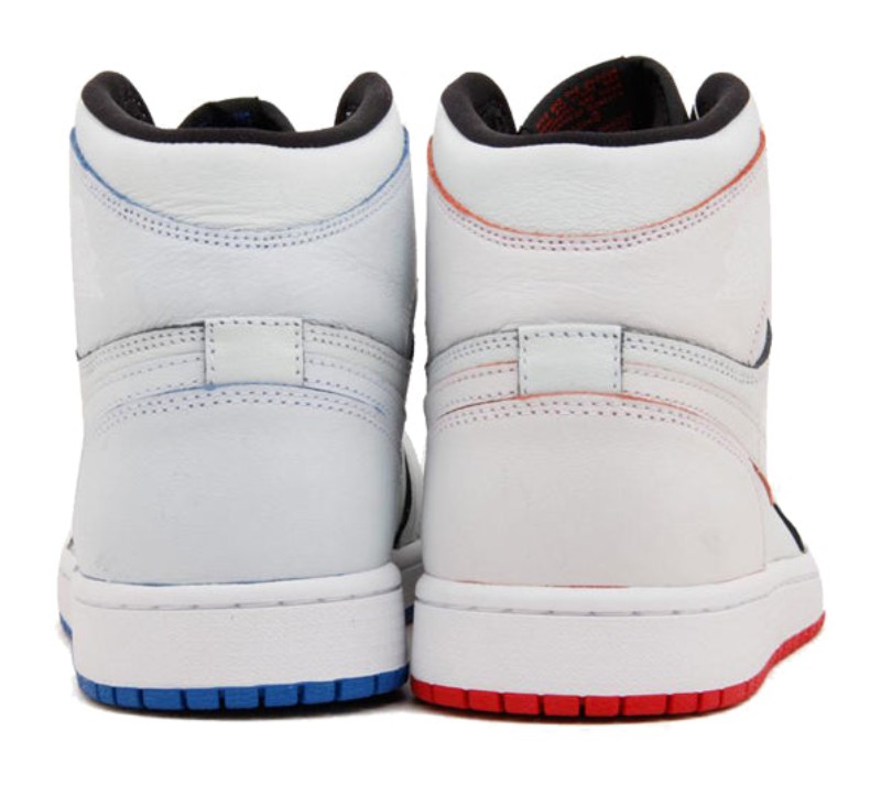 This collaboration with legendary skateboarder Lance Mountain pays tribute to the practice of early skaters mixing and matching Jordan 1s to create a unique pair, or painting over original colorways to cover damage. This "White" pair is painted completely white, but with wear, the outer white layer is designed to scrape off and reveal two different original colorways underneath: the "Bred" (Black/Red) colorway on the lateral side and the "Royal" (Black/Royal) colorway on the medial side. The contrasting laces (Red and Royal) are an intentional reference to the mismatched look.