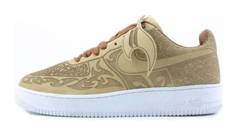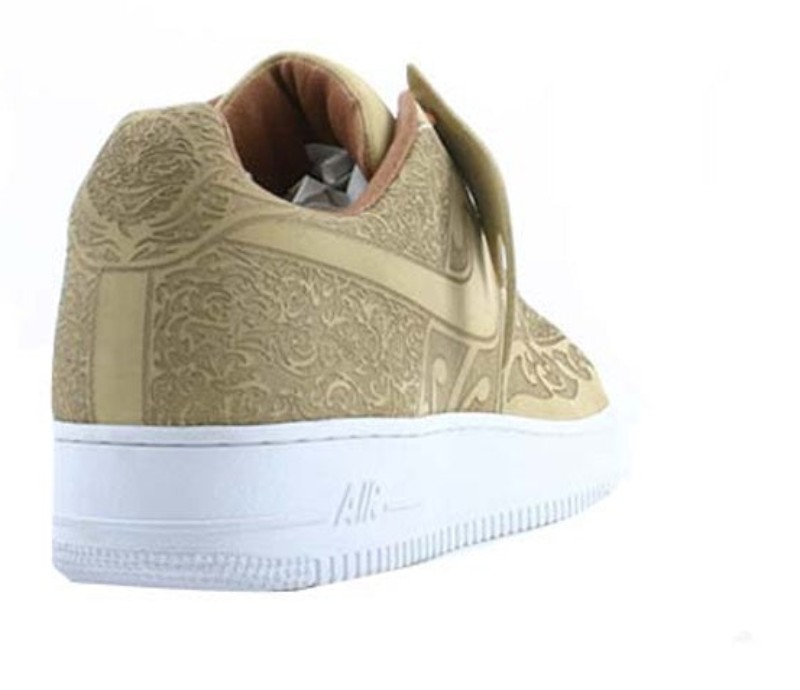 Designed by Mark Smith, this sneaker features a cashmere-colored leather upper with an intricate, laser-etched design covering most of the shoe. The Swooshes are also accented with the laser-cut effect.