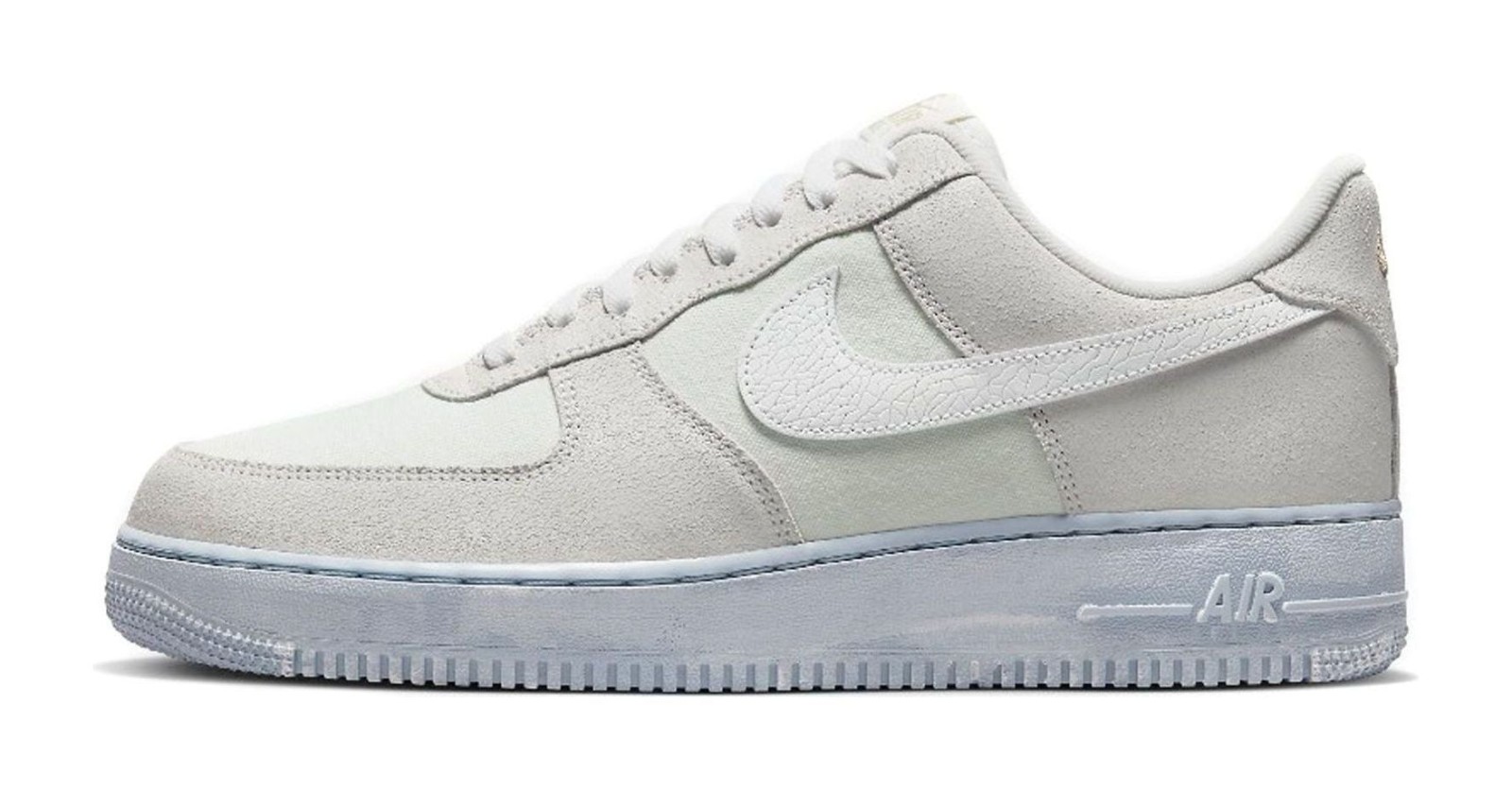 This Air Force 1 features a mixed-material upper of canvas underlays and salt-washed suede overlays, with design cues nodding to the 2023 NBA All-Star Game in Salt Lake City. The shoe is predominantly Summit White and features a distinctive cracked, textured leather Swoosh. The most unique detail is the Blue Whisper (light blue) hue applied to the midsole, giving it a subtle, "salt-washed" or inky, imperfect finish, ensuring no two pairs are exactly alike.