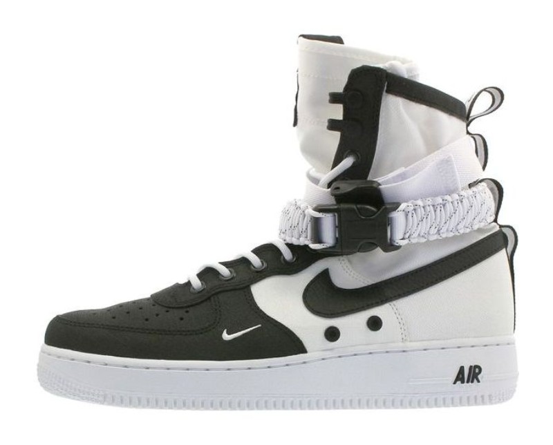 This is a high-top version of the military-inspired Special Field Air Force 1 (SF-AF1), featuring a rugged construction and a monochromatic "Panda" theme. The shoe boasts a combination of leather and ballistic nylon on the upper, primarily in White. It includes the model's signature high collar, chunky rope laces, and two distinctive ankle straps for a locked-down, utilitarian fit. The Black accents on the straps and possibly the outsole create the stark, contrasting color block that gives the sneaker its "Panda" nickname.
