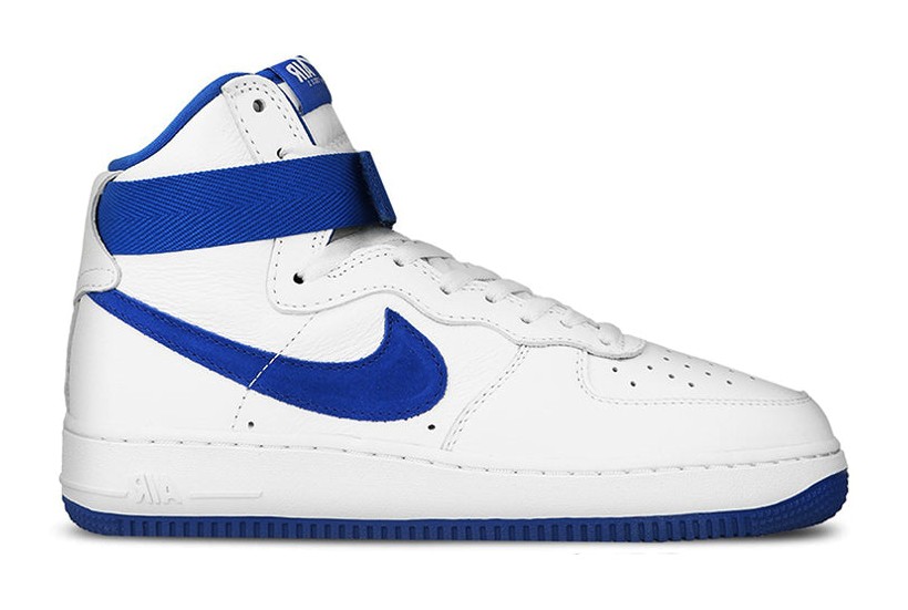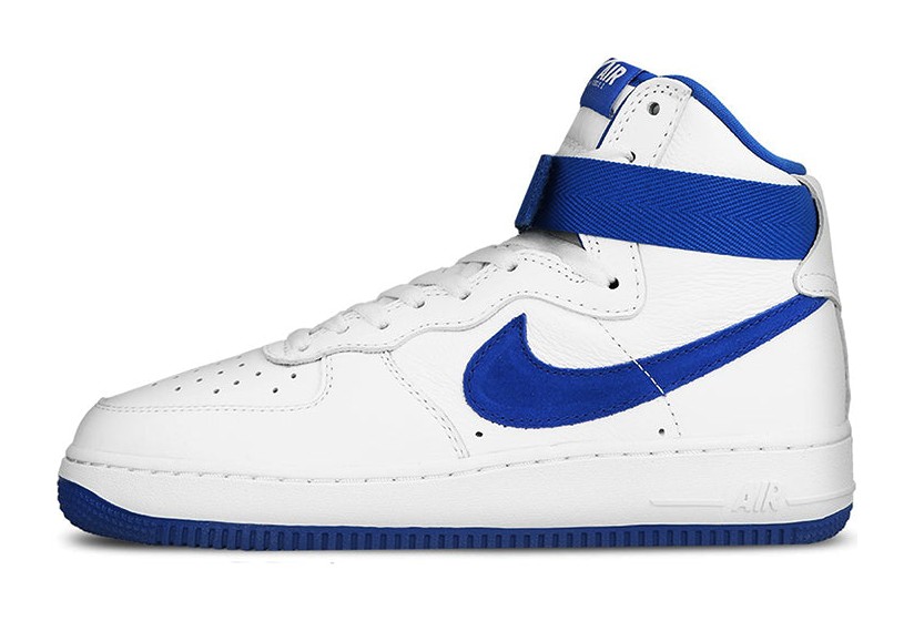 This sneaker is a Retro release of the original 1982 Air Force 1 High, featuring the classic high-top cut. The upper is constructed from premium "Summit White" leather with a perforated toe box. "Royal Blue" accents provide a striking contrast on the large side panel Swooshes, the inner lining, the adjustable ankle strap, and the rubber outsole, staying true to one of the original colorways from the model's debut.