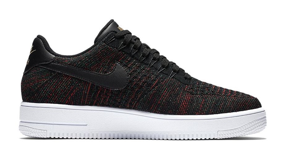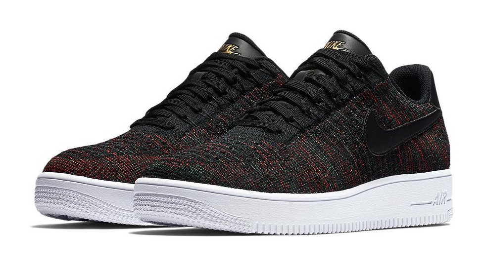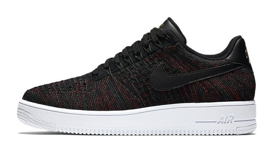 This model is an advanced, lightweight update to the classic Air Force 1. It utilizes a breathable, multi-colored Flyknit upper—primarily in black but interwoven with rich burgundy, hints of green, and bright crimson threads—making the shoe significantly lighter than the original. The shoe maintains the AF1's iconic structure, featuring black leather accents on the Swoosh and heel tab, a metallic gold lace lock, and is finished with the cored-out 'Ultra' sole unit in white for further weight reduction and flexibility.