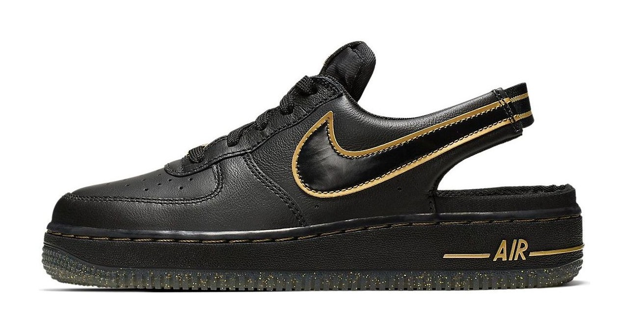 This sneaker is a youth-sized (Grade School, or "GS") variation of the classic Air Force 1 that converts the traditional lace-up silhouette into a slip-on shoe. It features a predominantly black leather upper with a distinctive metallic gold trim accenting the Swoosh logo. The most unique feature is the back portion of the shoe, which replaces the standard heel with a leather-covered, elastic slingback strap for an easy-on, easy-off, slip-on fit.