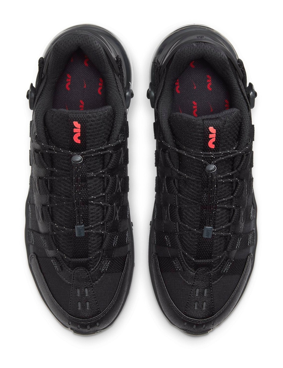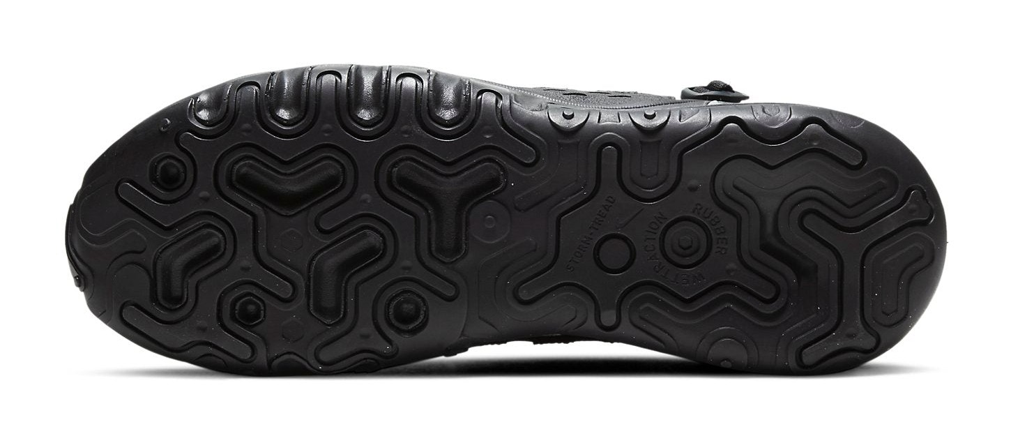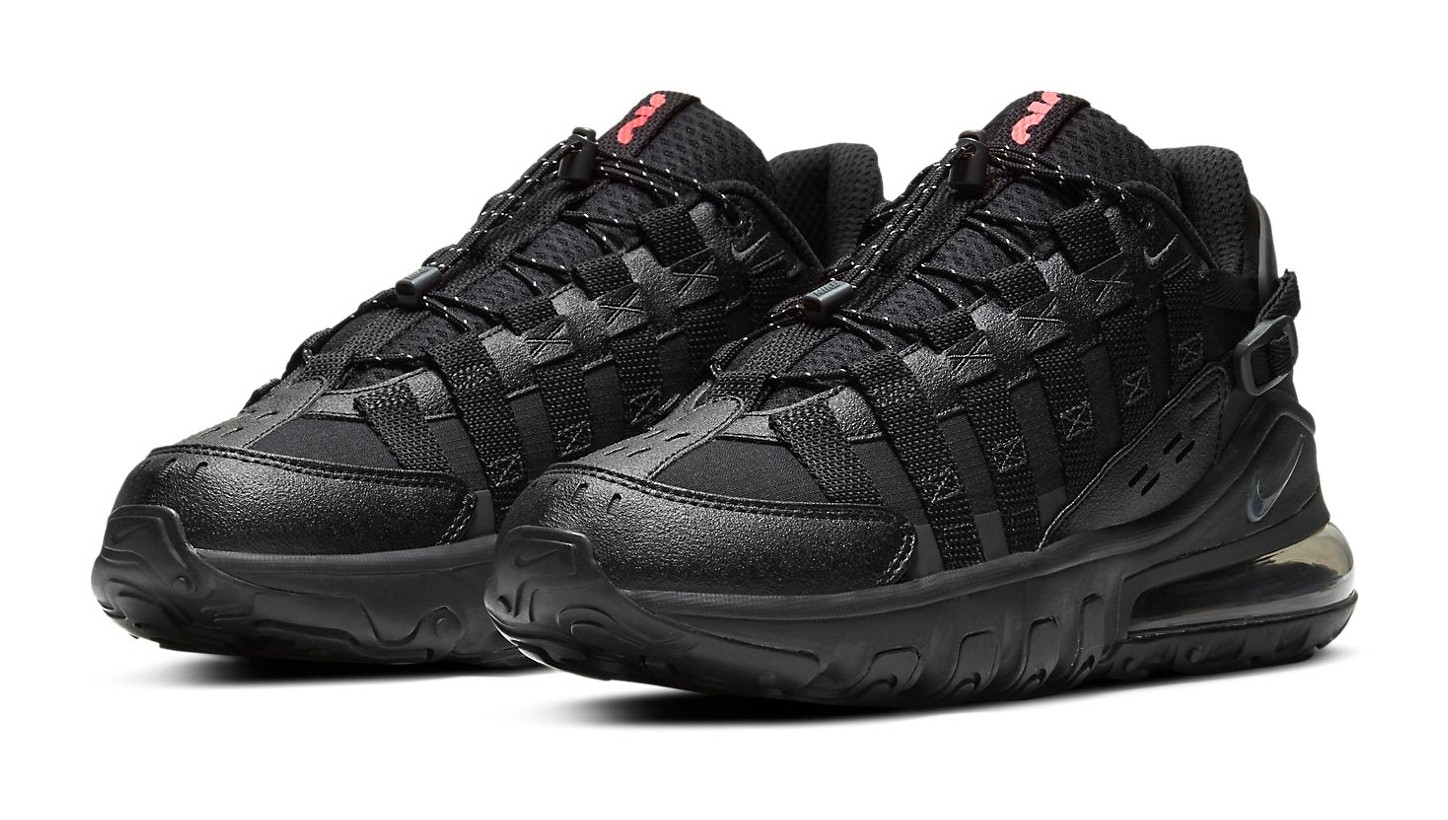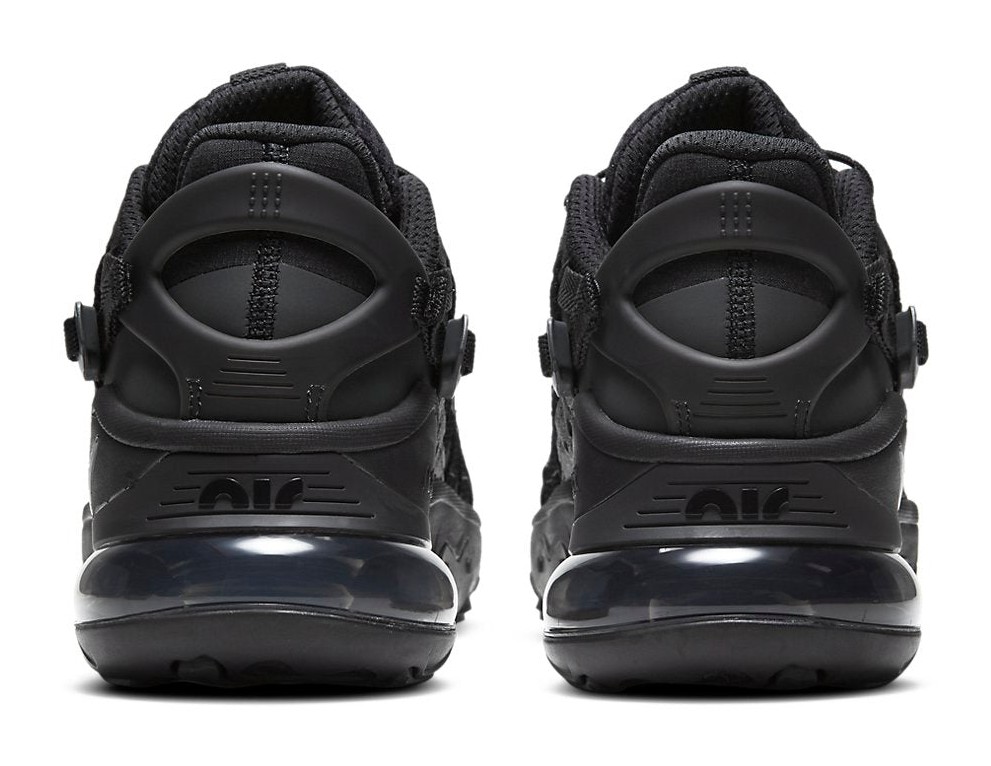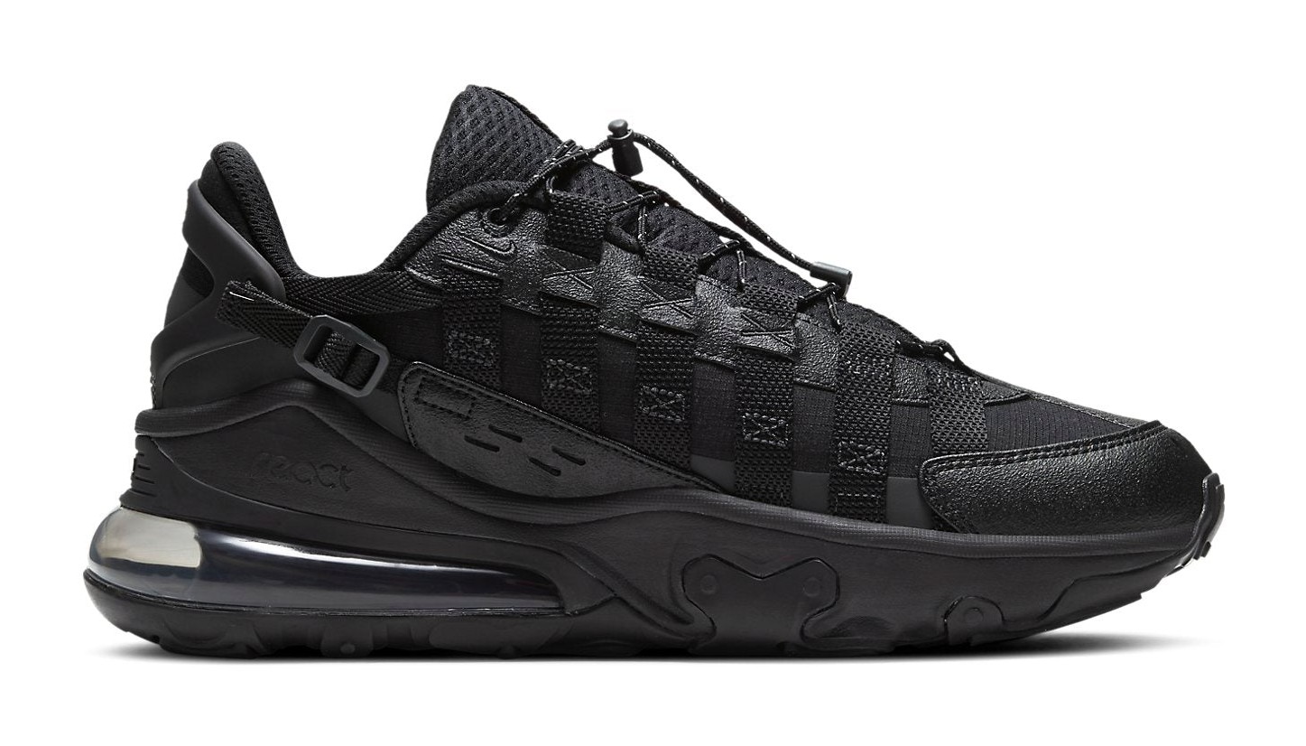 This utilitarian-inspired version of the Air Max 270 features a primarily black upper with ripstop and textured leather panels. Webbing straps run along the mid-panel and integrate with a rope-and-toggle lacing system. The shoe includes a Max Air unit for heel cushioning and React foam in the forefoot for a stable, comfortable ride. The design is accented with subtle details like a mini-Swoosh and a 3M-speckled lacing system.