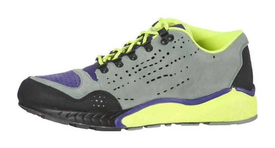 This ACG (All Conditions Gear) boot-style sneaker was built for both performance and rugged outdoor use, featuring a nubuck and nylon upper in a mix of grey, purple, and black tones. It includes D-ring lacing for a secure fit and a classic Talaria midsole with full-length Zoom Air and Phylon for cushioning. The shoe has a durable rubber outsole for traction and a mid-top silhouette.
