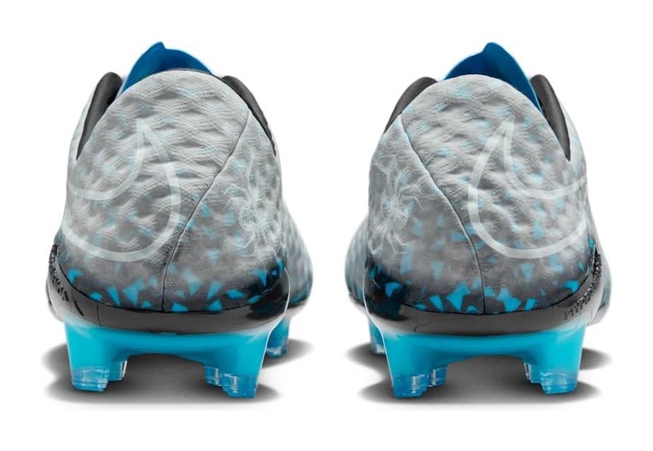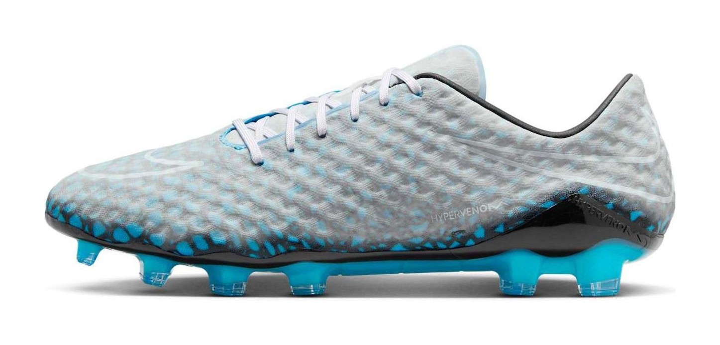 This football boot features a grey upper with black and blue accents. The key feature is the "Transform" technology on the upper, which uses a special material that, when dipped in water or when playing in wet conditions, reveals a hidden pattern underneath the surface. The design is a regeneration of the original Hypervenom, with the inclusion of the fan-favorite Hypervenom Phantom III plate for agile traction and responsive stability on dry, natural-grass pitches.
