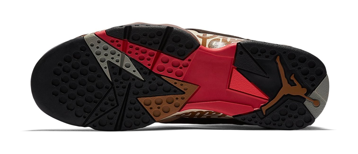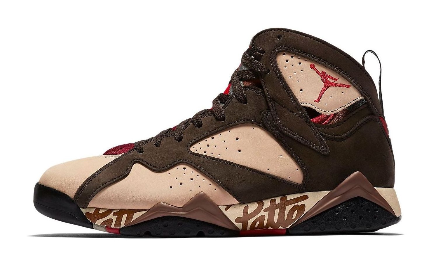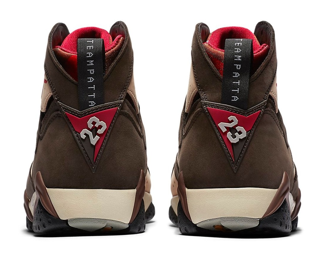 This sneaker is the first of two colorways released in the collaboration between Amsterdam-based streetwear brand Patta and Jordan Brand. The design features a premium upper with a base color of 'Shimmer' (a light tan/peach color), complemented by overlays in 'Velvet Brown' and 'Mahogany Mink' (earthy brown tones). 'Tough Red' accents are seen on the Jumpman logo and the signature geometric detailing of the Air Jordan 7 midsole. Unique to this collaboration, the word "Patta" is subtly scripted along the midsole, replacing part of the shoe's traditional graphic pattern. The shoe uses a mix of high-quality suede and nubuck on the upper.