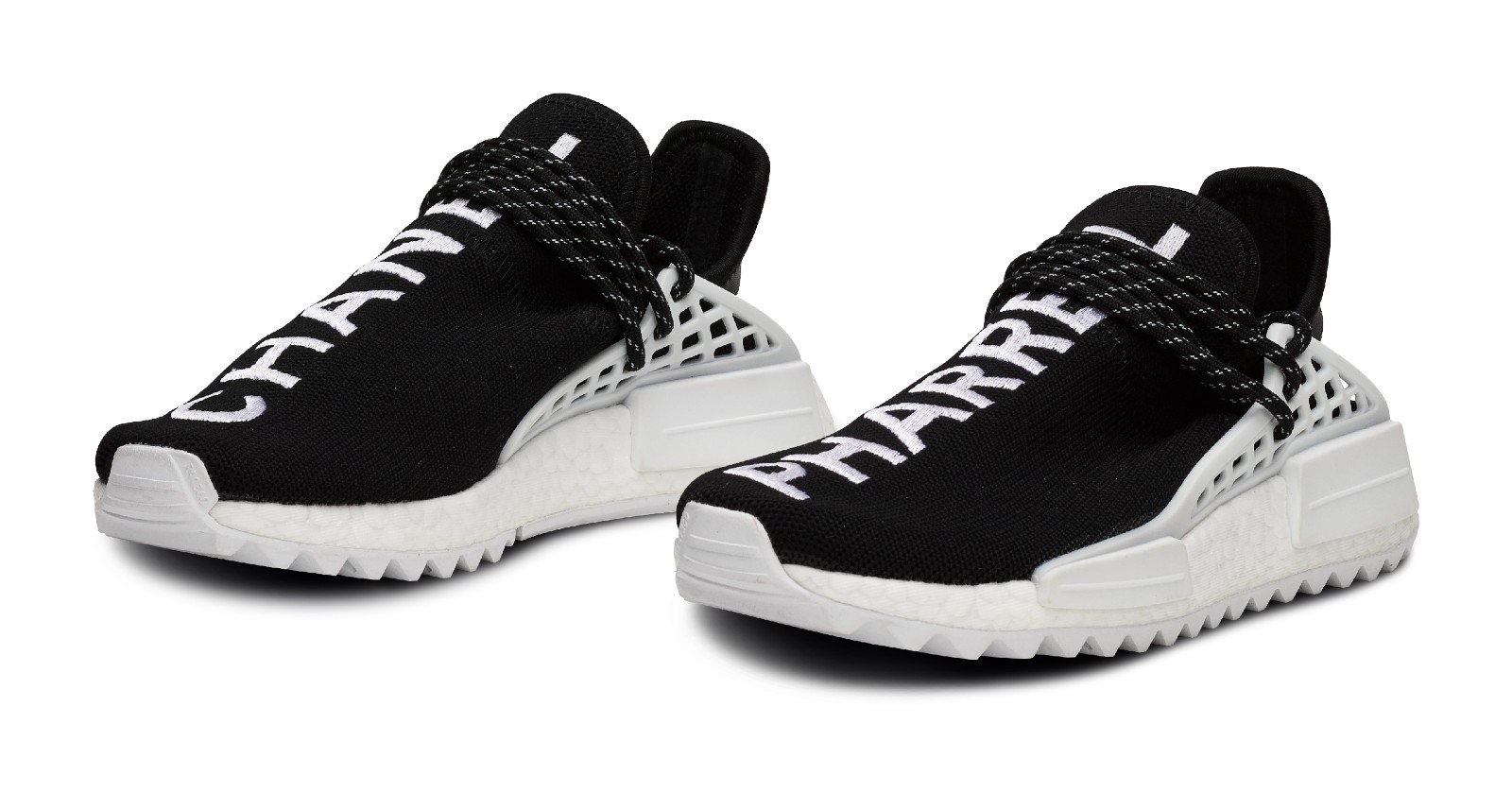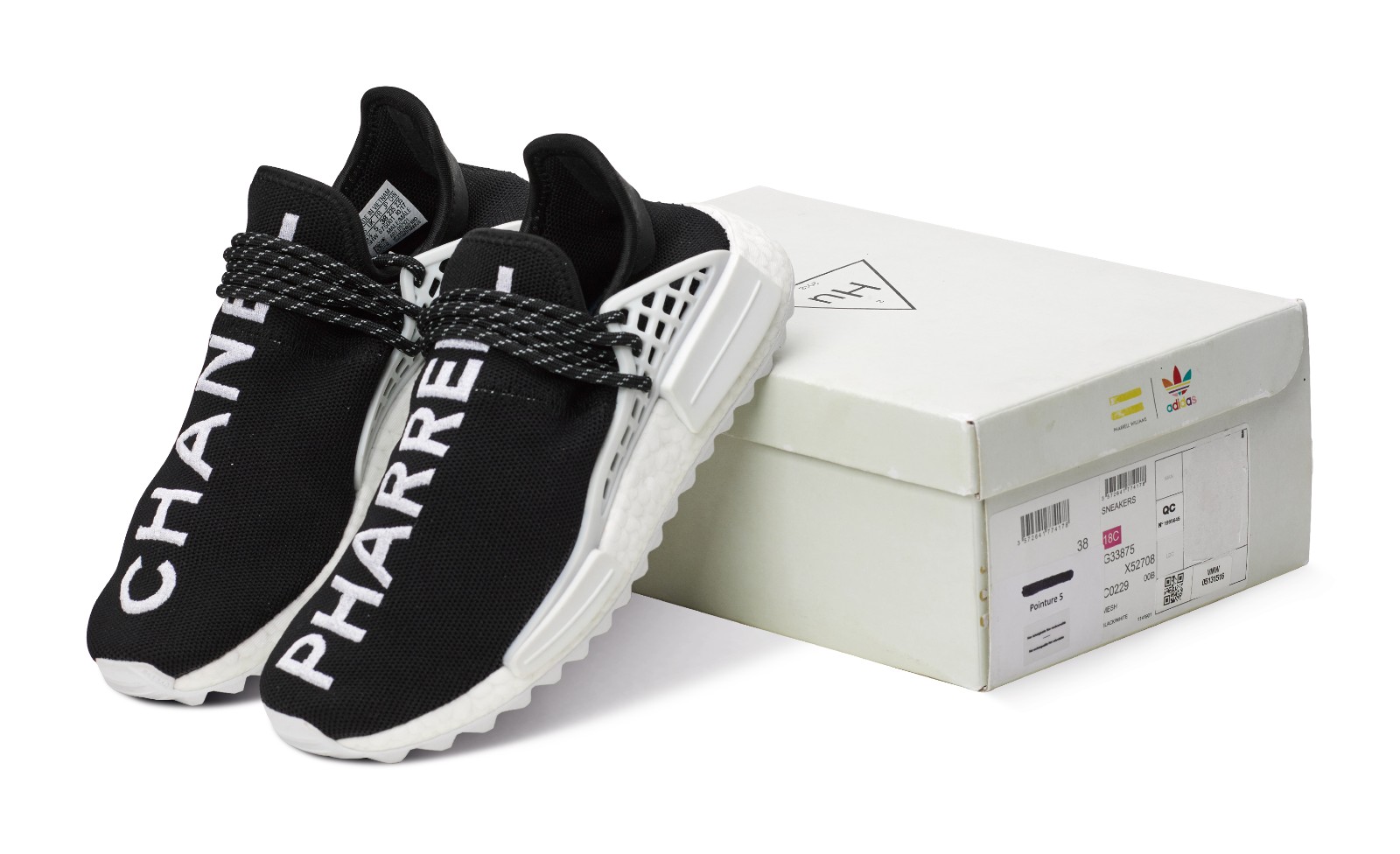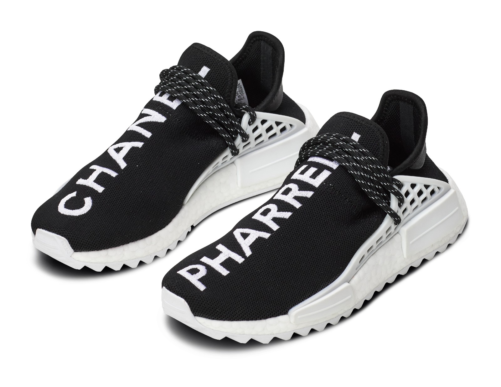 This men's and unisex sneaker is a rare collaboration between Adidas Originals, Chanel, and Pharrell Williams. It features a black Primeknit upper with "PHARRELL" embroidered on one shoe and "CHANEL" embroidered on the other in contrasting white. The shoe includes a responsive Boost midsole and a trail-inspired rubber outsole for added grip. The lacing cage is black, and a white bumper is located on the midsole.
