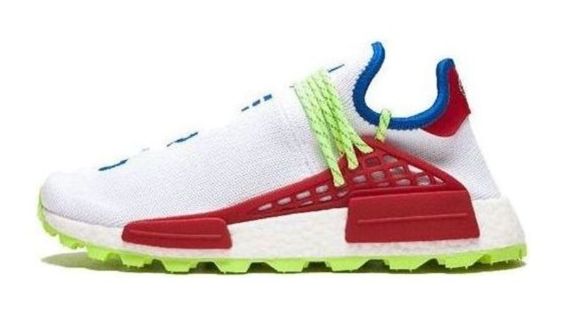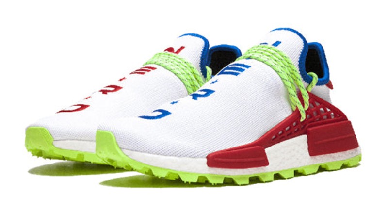 This sneaker was an exclusive release for the Shaggfest music festival in Pharrell's hometown of Virginia Beach. It features a predominantly White Primeknit upper. The signature embroidered text spells out "N.E.R.D."—Pharrell's band—with the letters on the left shoe in Red and the letters on the right shoe in Blue. The design is accented with Red on the TPU lace cage and EVA stability plugs, while the laces and the trail rubber outsole are a vibrant Neon Green. The full-length BOOST midsole is white, and the leather heel tabs are red.