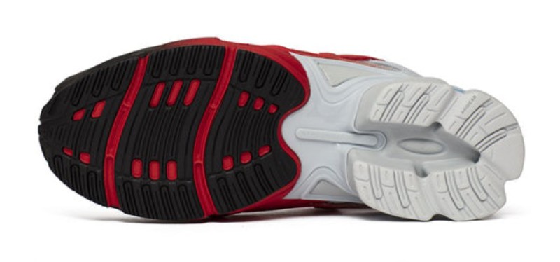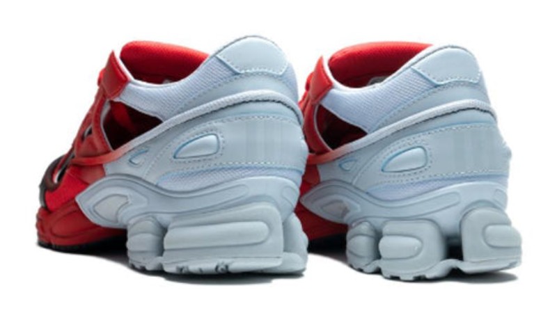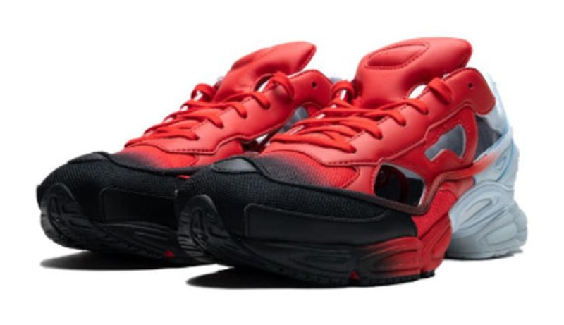 The Adidas Raf Simons x Replicant Ozweego (EE7933) "Red Halo Blue" is a bold, chunky lifestyle sneaker. It features a textile and synthetic upper with a gradient color effect that transitions from a dark toe (Core Black) to a vibrant Red across the midfoot, and a light grey around the heel area.
