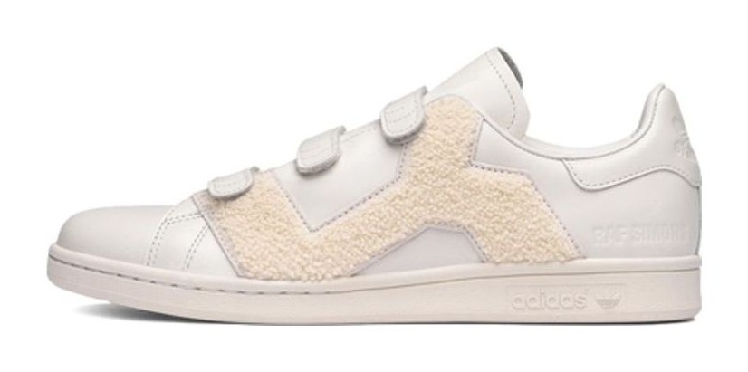 A men's and unisex low-top sneaker featuring a soft, premium leather upper in an off-white, "Talc" colorway. It replaces the traditional lace-up closure with three velcro straps. An oversized, textured chenille patch of a letter "R" or "S" (for Raf Simons) is featured on the side of each shoe. The shoe includes a Poron® Performance cushioning sockliner and a tonal rubber sole.