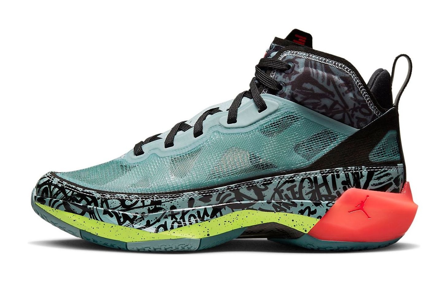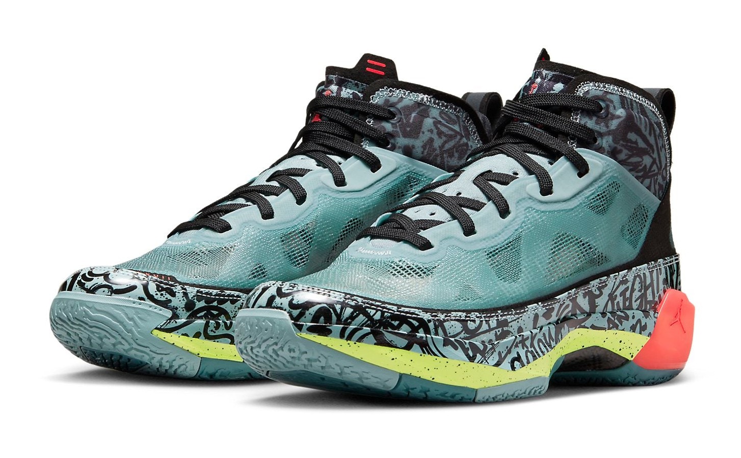 The Air Jordan 37 PF 'Graffiti' is a special Player Edition (PE) for WNBA star Satou Sabally. The sneaker, released in Women's sizing, is highly colorful and energetic, inspired by the creativity and street art of graffiti. The upper is a vibrant mix of Ocean Cube (a bright blue/green teal) and Volt (a neon yellow-green), featuring an all-over, abstract, graffiti-like pattern visible beneath the leno-weave material. Black accents provide contrast on the tongue and heel, while Flash Crimson (a hot red/pink) highlights the Jumpman logo and other details. The PF (Performance Fit) outsole is designed with extra durability for outdoor play.