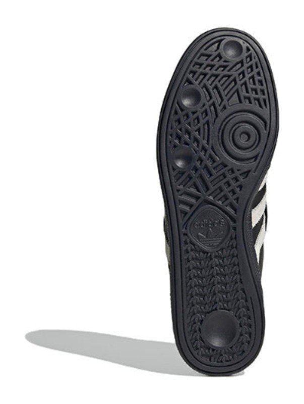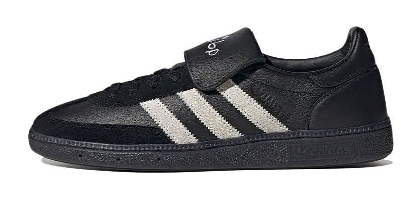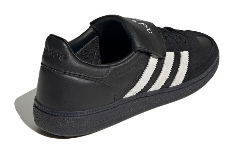 This collaborative edition of the classic Handball Spezial features a sleek Core Black color scheme across a premium leather upper and smooth suede overlays. The dark upper is sharply contrasted by the Cloud White leather on the signature 3-Stripes and the heel tab, creating a traditional, high-contrast look. The design is a nod to football culture, inspired by SHUKYU magazine's editor-in-chief, and includes a foldable tongue and a durable rubber outsole for a confident, lifestyle aesthetic.