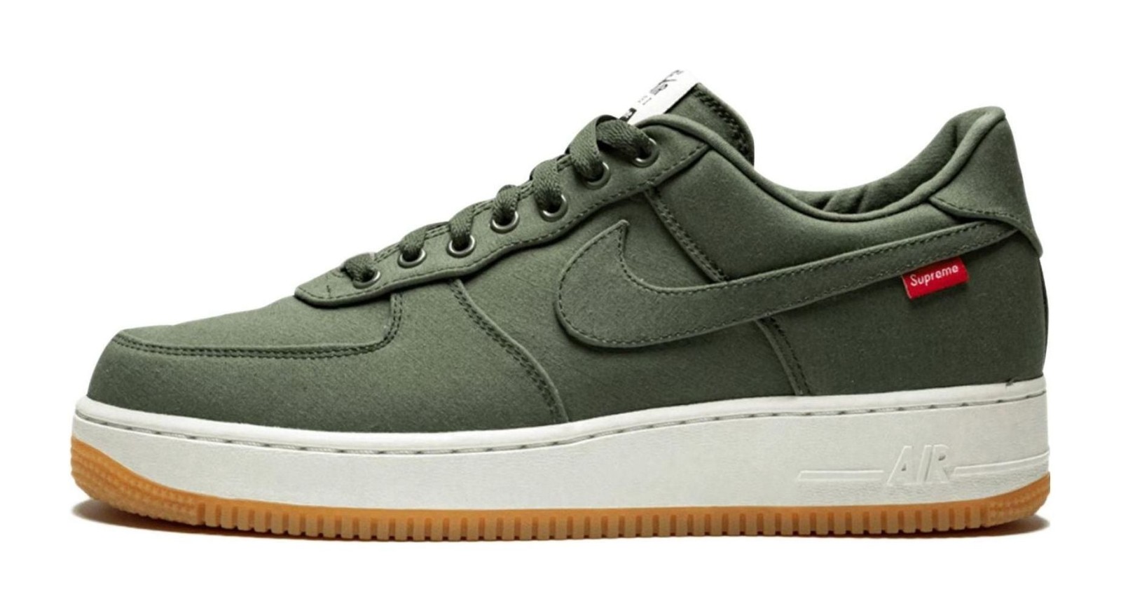 This model is part of a three-shoe pack (alongside Black and Camo colorways) and features a monochromatic upper constructed entirely from durable canvas material in a deep Cargo Khaki/Olive green tone. Subtle Supreme branding is present via a red box logo tag stitched to the lateral Swoosh and on the lace deubré. The military-inspired upper is set atop a clean white midsole and a gum rubber outsole. The insole is a contrasting bright red with dual Supreme and Nike Air branding.