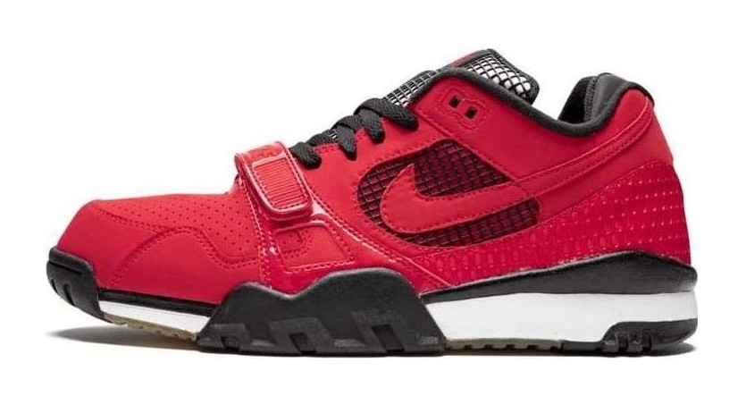 This sneaker is part of a rare collaboration with streetwear brand Supreme, marking the first time the 1989 Air Trainer silhouette was reissued under the Nike SB (Skateboarding) line. The shoe features a vibrant Fire Red nubuck and mesh upper with black accents on the Swoosh, strap hardware, heel, and outsole. A signature detail is the use of net mesh panels and the Supreme logo subtly visible through the icy (translucent) portion of the outsole. This release was part of a four-colorway pack and paid homage to the original Air Trainer spokesperson, Bo Jackson.