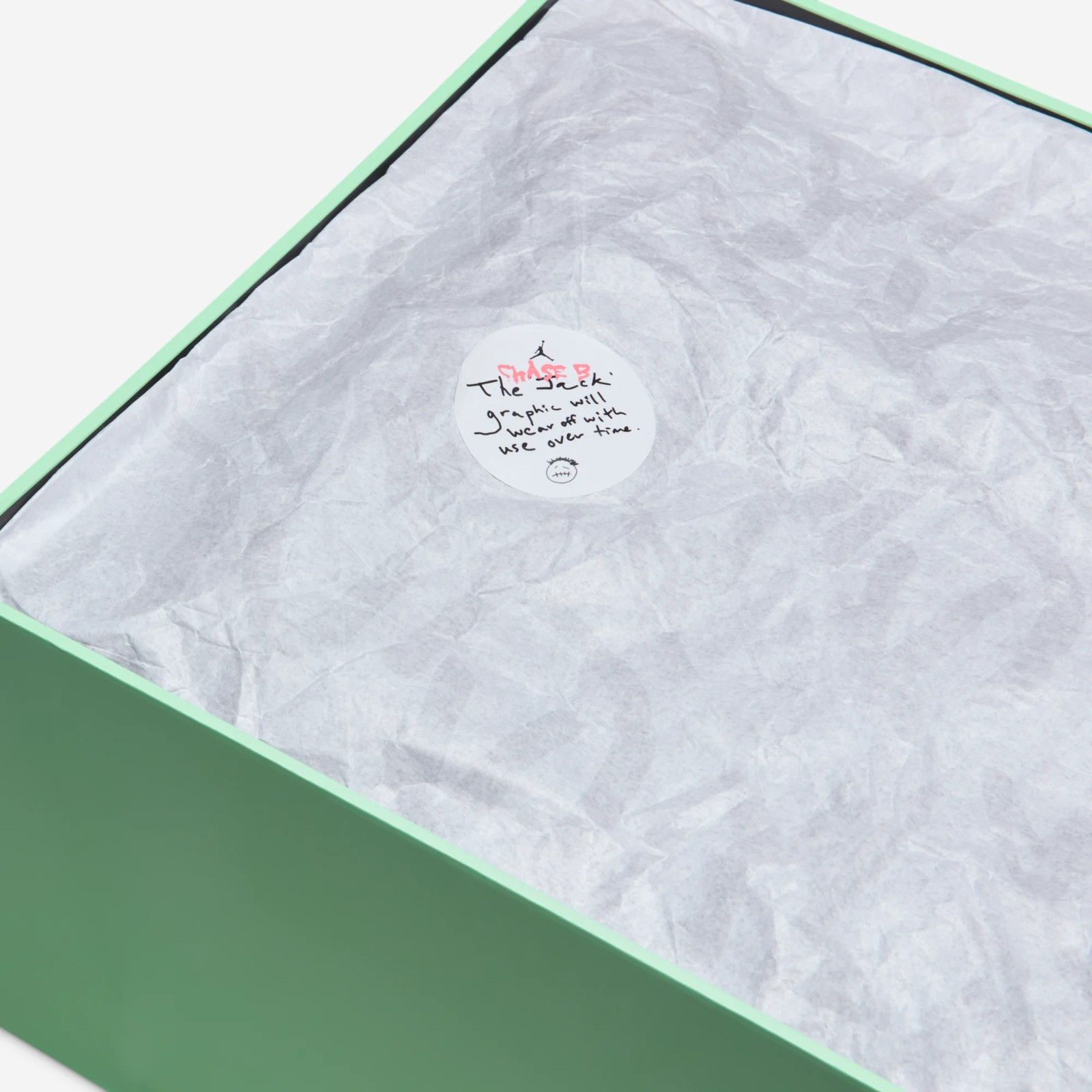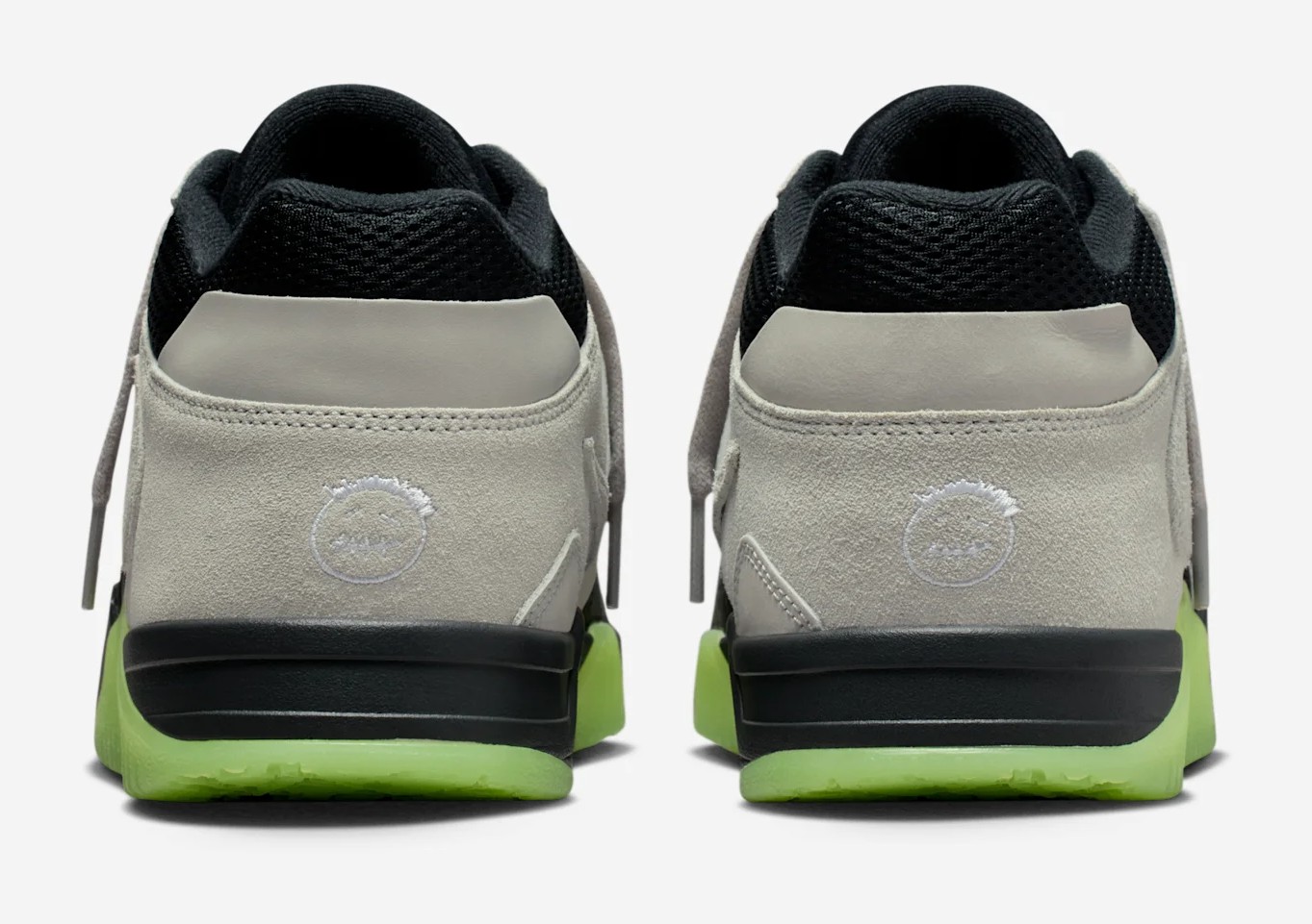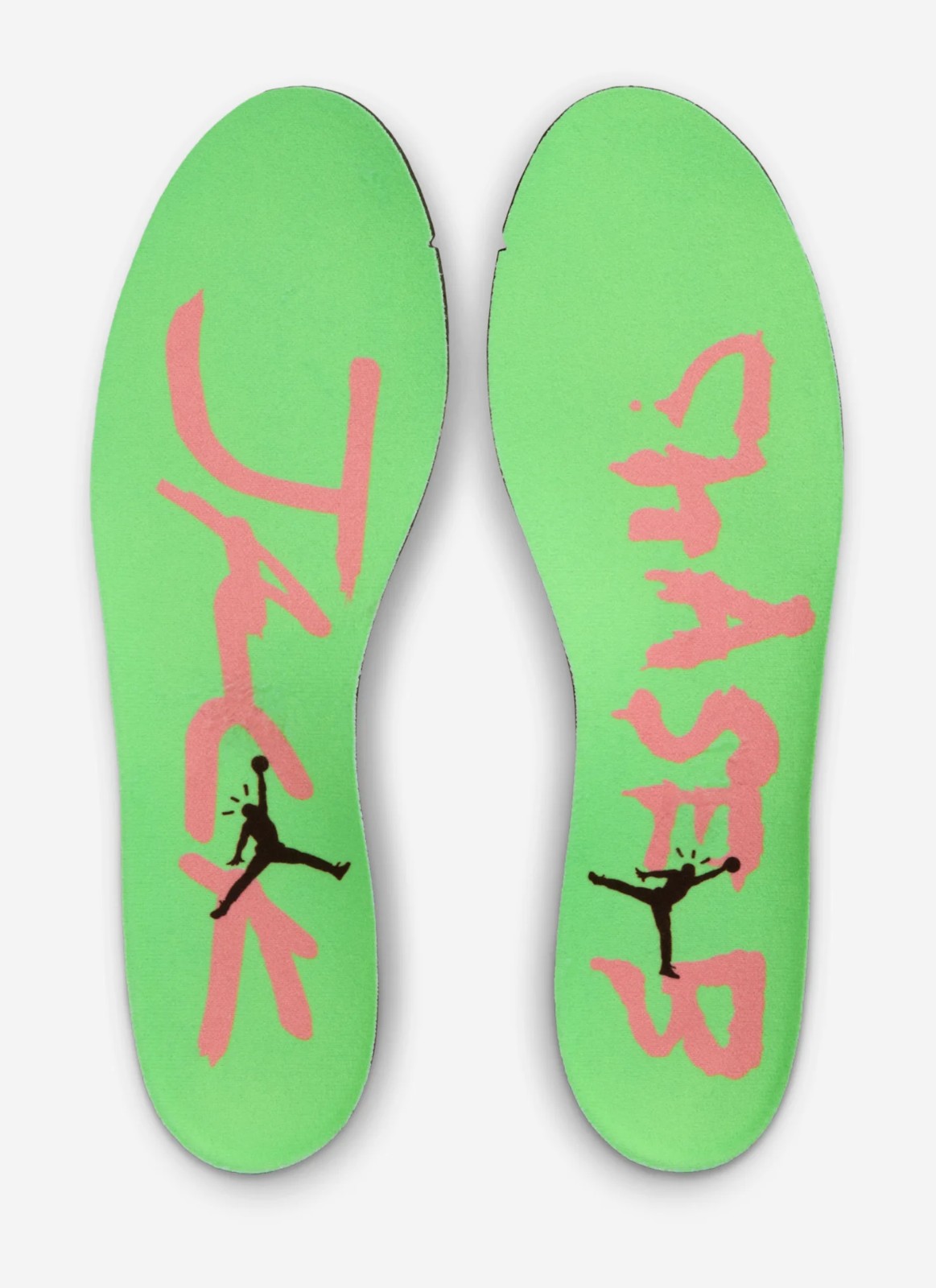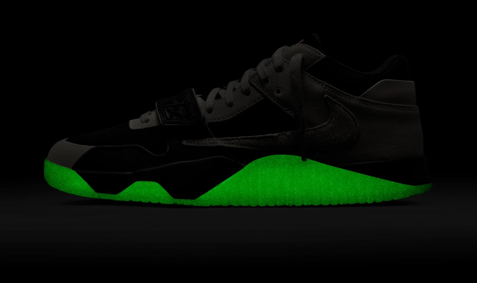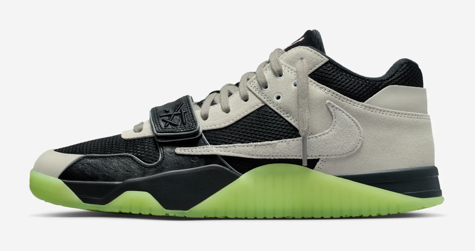This shoe is a collaboration between musical artist Travis Scott and his long-time DJ and producer, Chase B. The shoe's design features a mix of a Black mesh base with Night Silver (a light grey) suede panels and faux ostrich leather accents on the forefoot and strap. The signature Travis Scott elements include the reverse Swoosh and the midfoot strap. The design is finished with bold pops of Illusion Green on the outsole, which is noted to glow-in-the-dark, and Coral Chalk (a pink hue) on the Jumpman logo and reflective piping for a vibrant contrast against the dark upper.