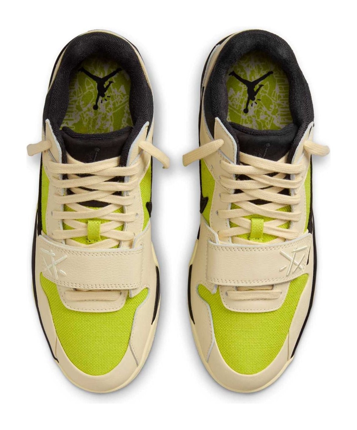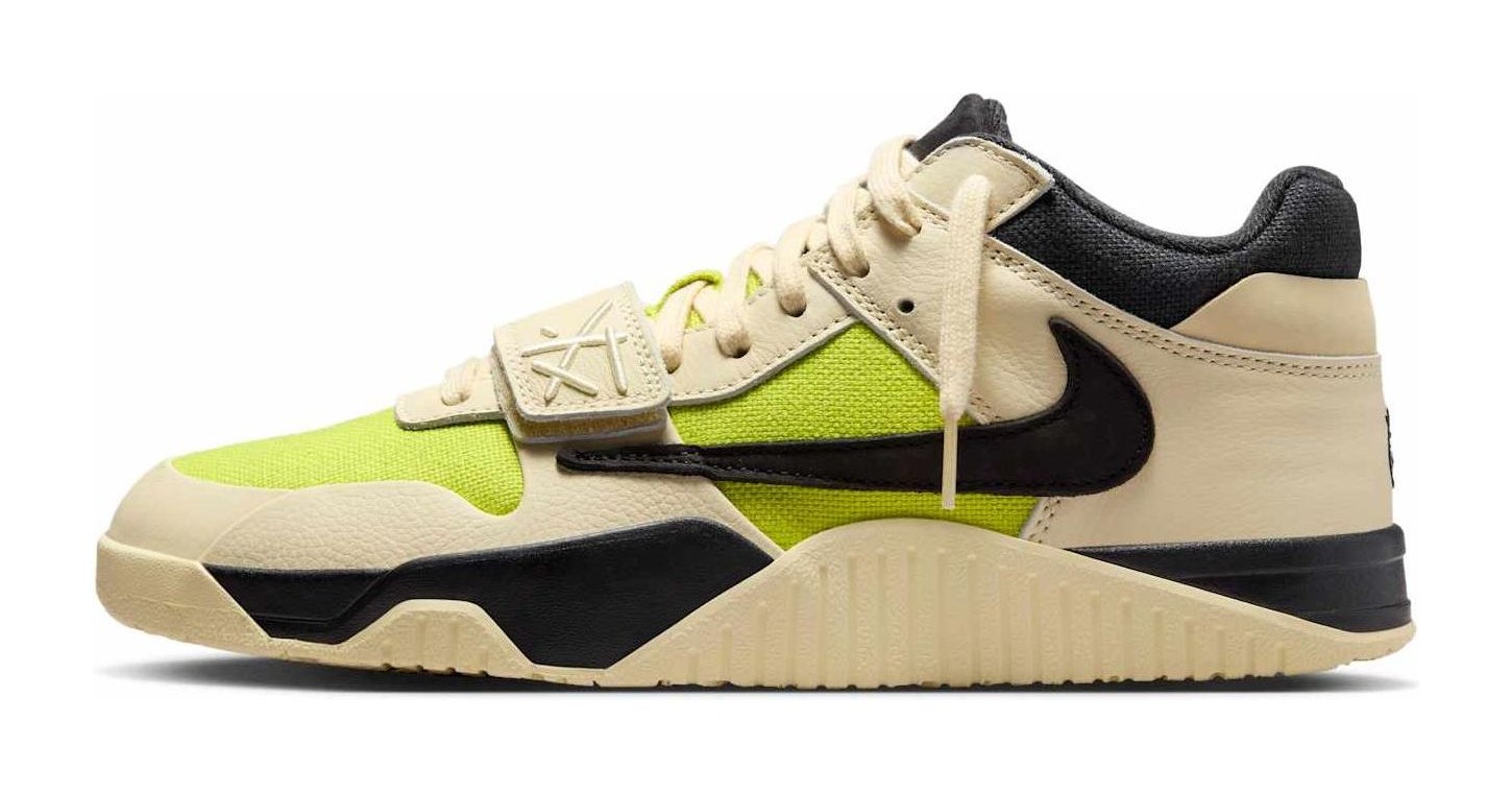 This exclusive sneaker from the Jordan Brand and Travis Scott is one of the debut colorways for the artist's first signature model, the Jumpman Jack. The shoe features a base of Bright Cactus (a vibrant yellow-green) canvas on the mid-panel and toe box, framed by premium Muslin (an off-white/cream) leather overlays. Signature Travis Scott details include a prominent black reverse Swoosh on the lateral side, the "Cactus Jack" smiley face logo stitched onto the heel, and a forefoot strap for stability. The tooling is a flat, durable design, with the word "JACK" debossed into the outsole. The release is a highly coveted, limited edition drop.