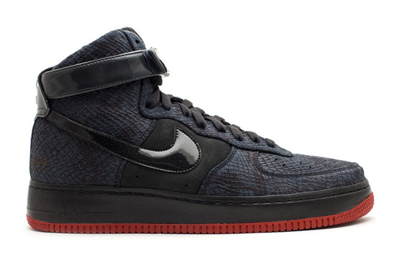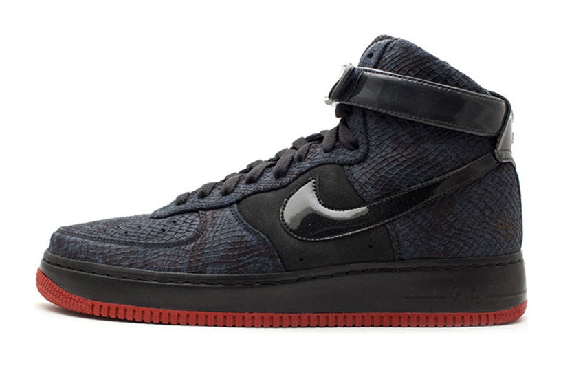 This sneaker was designed by Undefeated founder Eddie Cruz and released as part of the 2009 "East vs. West" collaboration. It features a dark suede upper with faux snakeskin overlays at the front and back. A patent leather ankle strap and Swoosh provide a glossy contrast, and the shoe is finished with a vibrant red rubber outsole. It is constructed with Nike's classic Air cushioning.