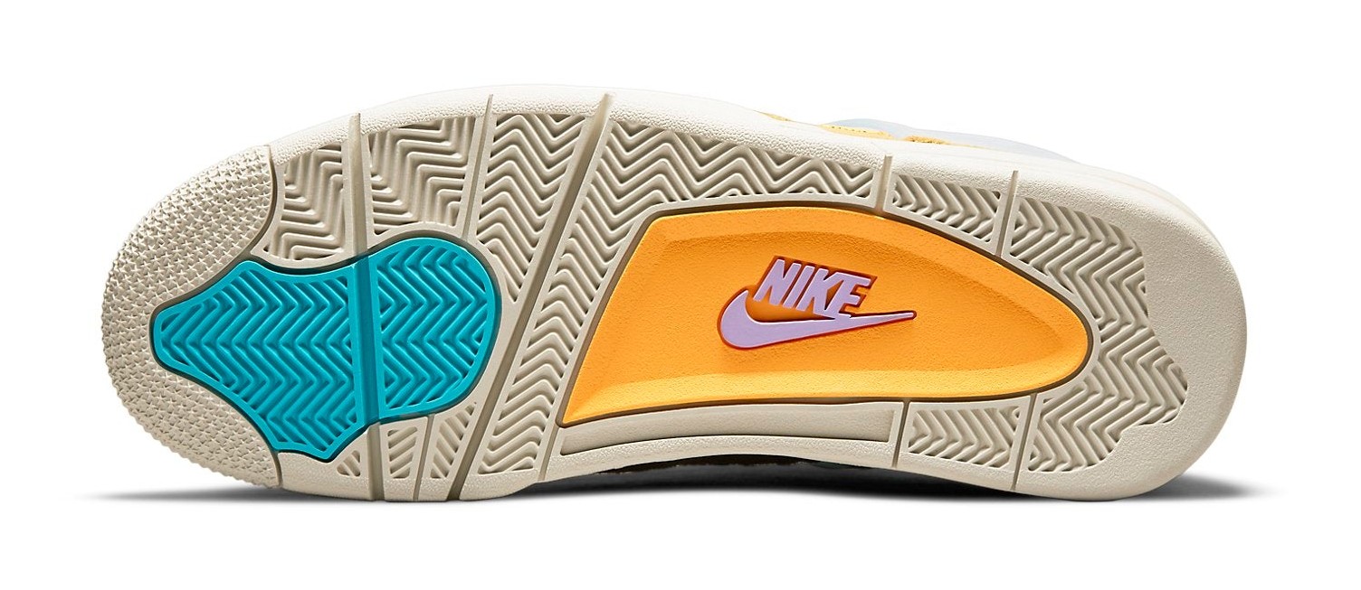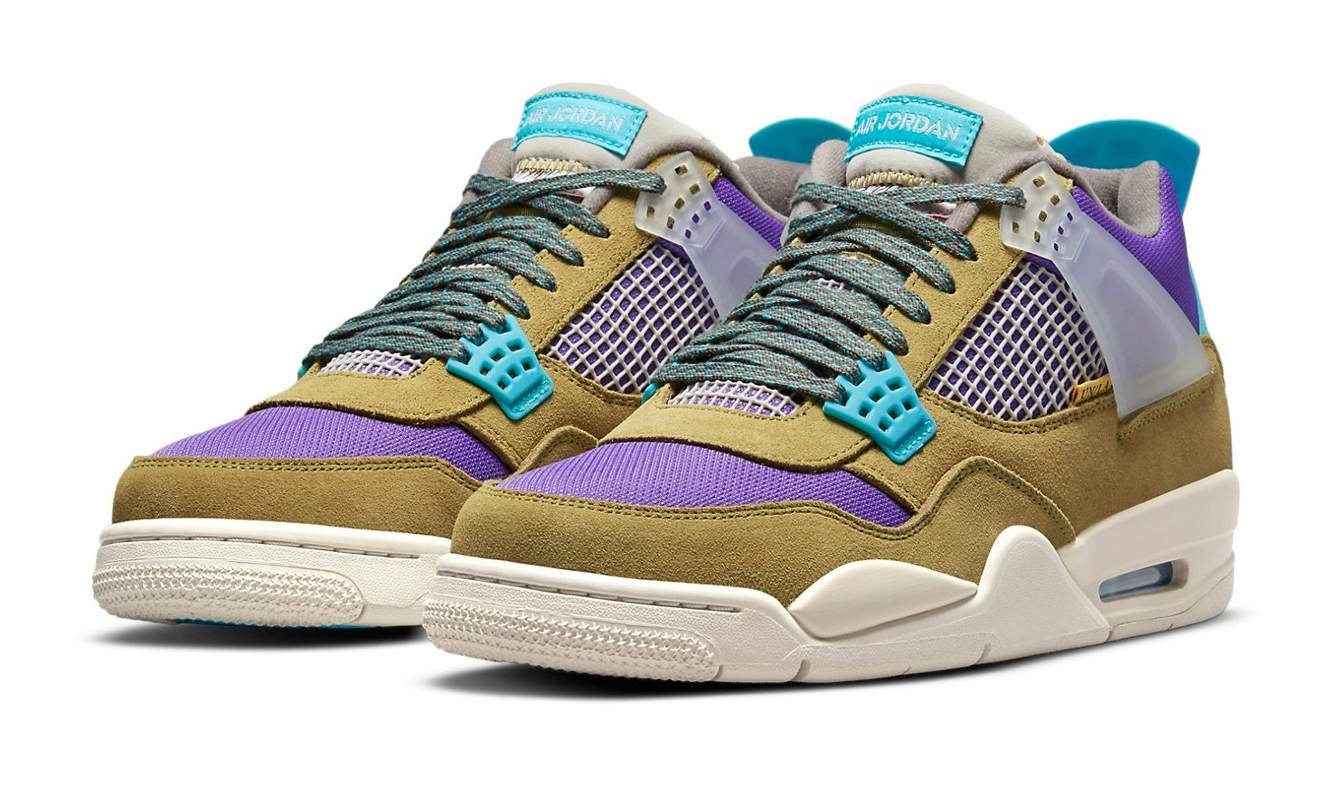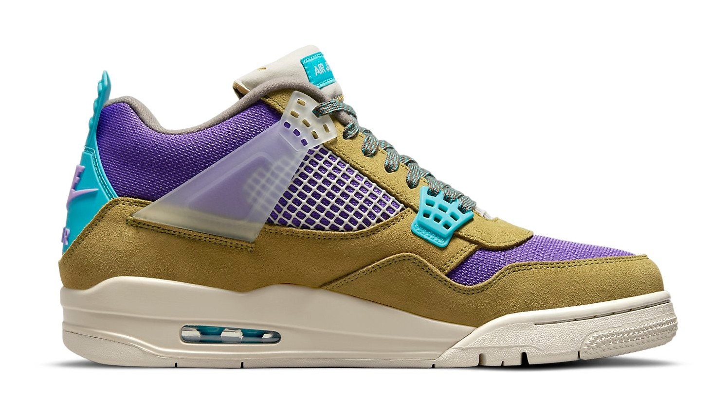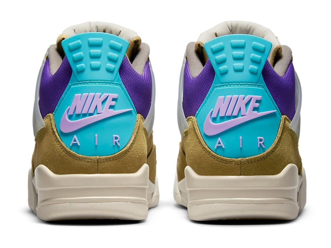 A striking colorway resulting from the collaboration with Union LA to celebrate the boutique's 30th anniversary. The upper features a unique mix of materials, dominated by Desert Moss suede overlays and a Dark Iris mesh base. The shoe is highlighted by vibrant Turquoise Blue accents on the heel tabs and the exposed tongue. A key design element carried over from the first Union x AJ4 release is the distinctive Union-branded woven tag on the lateral side of the ankle and the partially stitched-down tongue, which can be easily detached to expose the full tongue.
