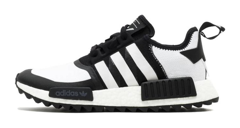 This is a collaboration between adidas and the Japanese outdoor-focused brand White Mountaineering. The shoe features a durable NMD_R1 Trail outsole for improved grip, replacing the standard NMD outsole. The upper is constructed from Primeknit in Core Black, offering a flexible and sock-like fit. The "Black White" colorway creates a clean two-tone look, with the full-length BOOST midsole and signature TPU plugs dressed in Footwear White. Subtle White Mountaineering branding is placed on the tongue and heel loop, distinguishing this trail-ready version of the NMD.