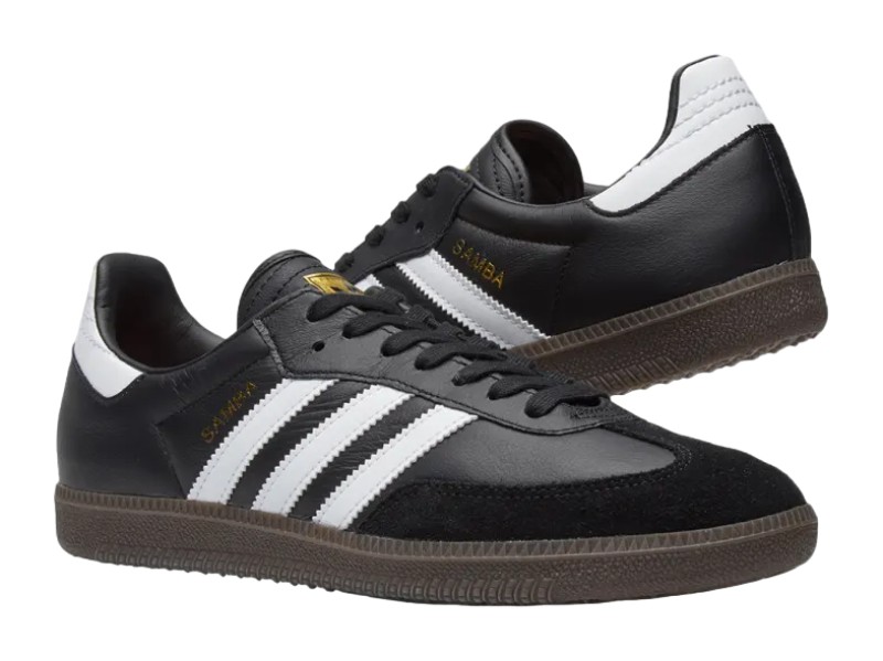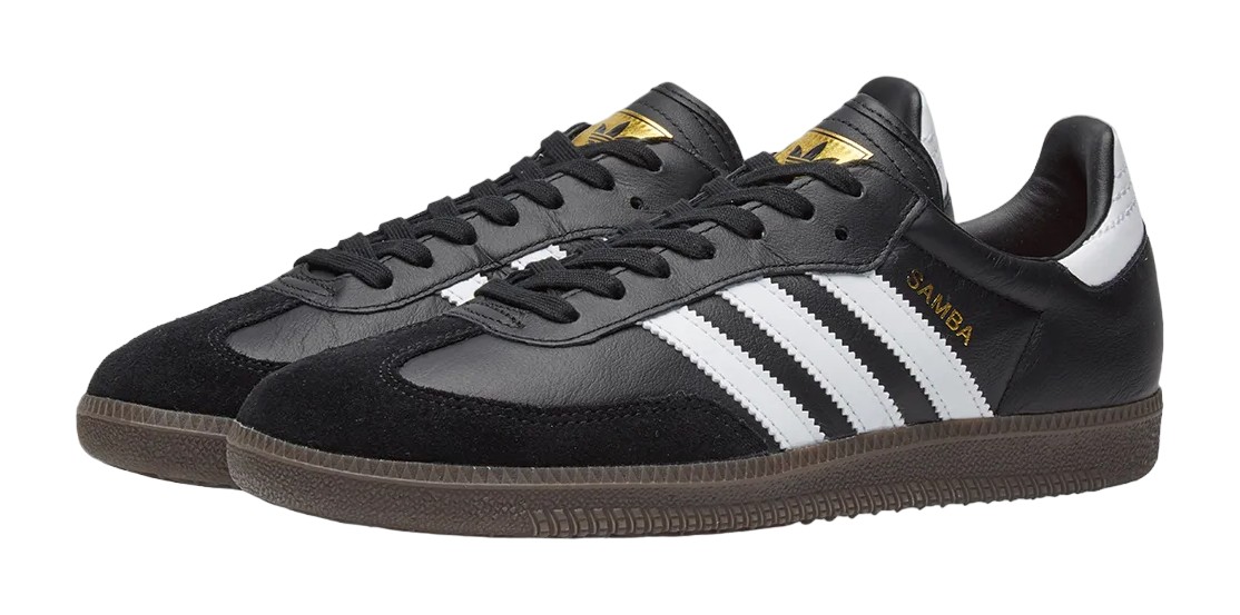 This colorway features a Core Black leather upper, which is complemented by a suede T-toe overlay. The iconic, serrated Three-Stripes and the heel tab are in crisp Footwear White. The gold-foil "SAMBA" branding is stamped on the lateral side. The shoe is completed with a classic, semi-translucent Gum rubber outsole, which is the traditional look for the indoor soccer-derived model, ensuring a clean, contrast-heavy, and true-to-heritage aesthetic.
