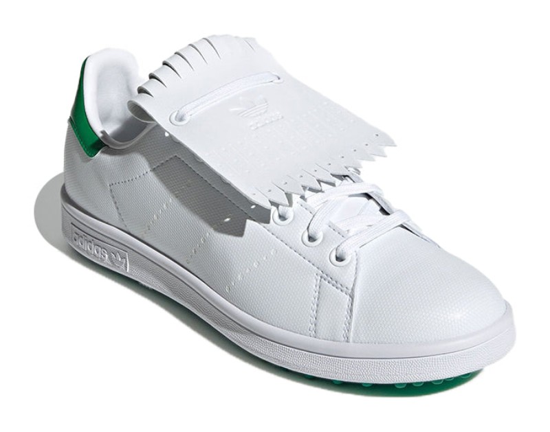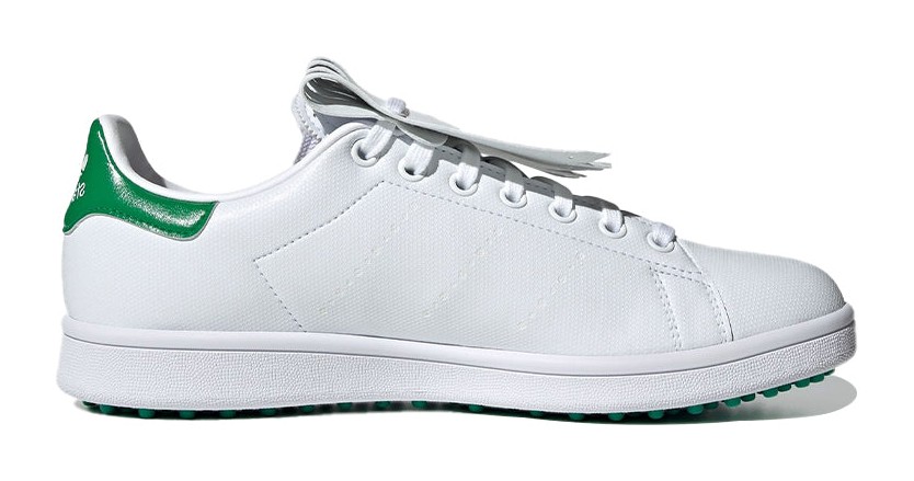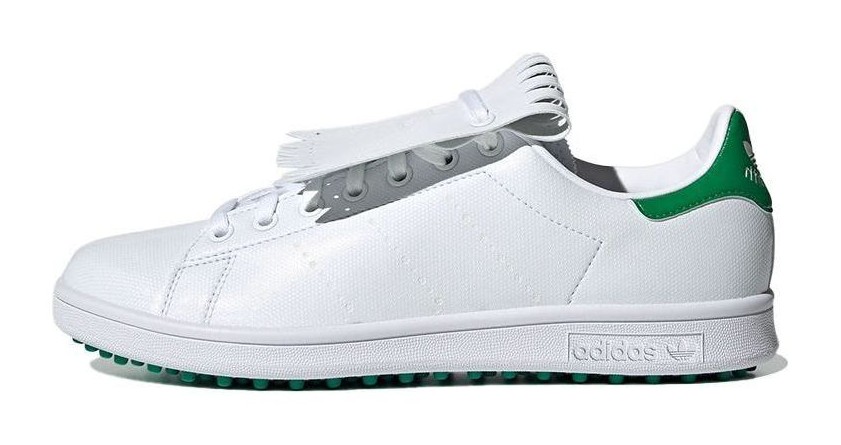 This golf version of the classic Stan Smith features a clean Cloud White upper constructed from Primegreen recycled materials. The iconic court aesthetic is maintained with the white base, perforated Three Stripes, and a contrasting Green heel tab. The key feature is the spikeless rubber outsole, which provides turf-friendly grip while keeping the flat, classic look of the tennis shoe silhouette, making it an environmentally-conscious, versatile golf shoe.