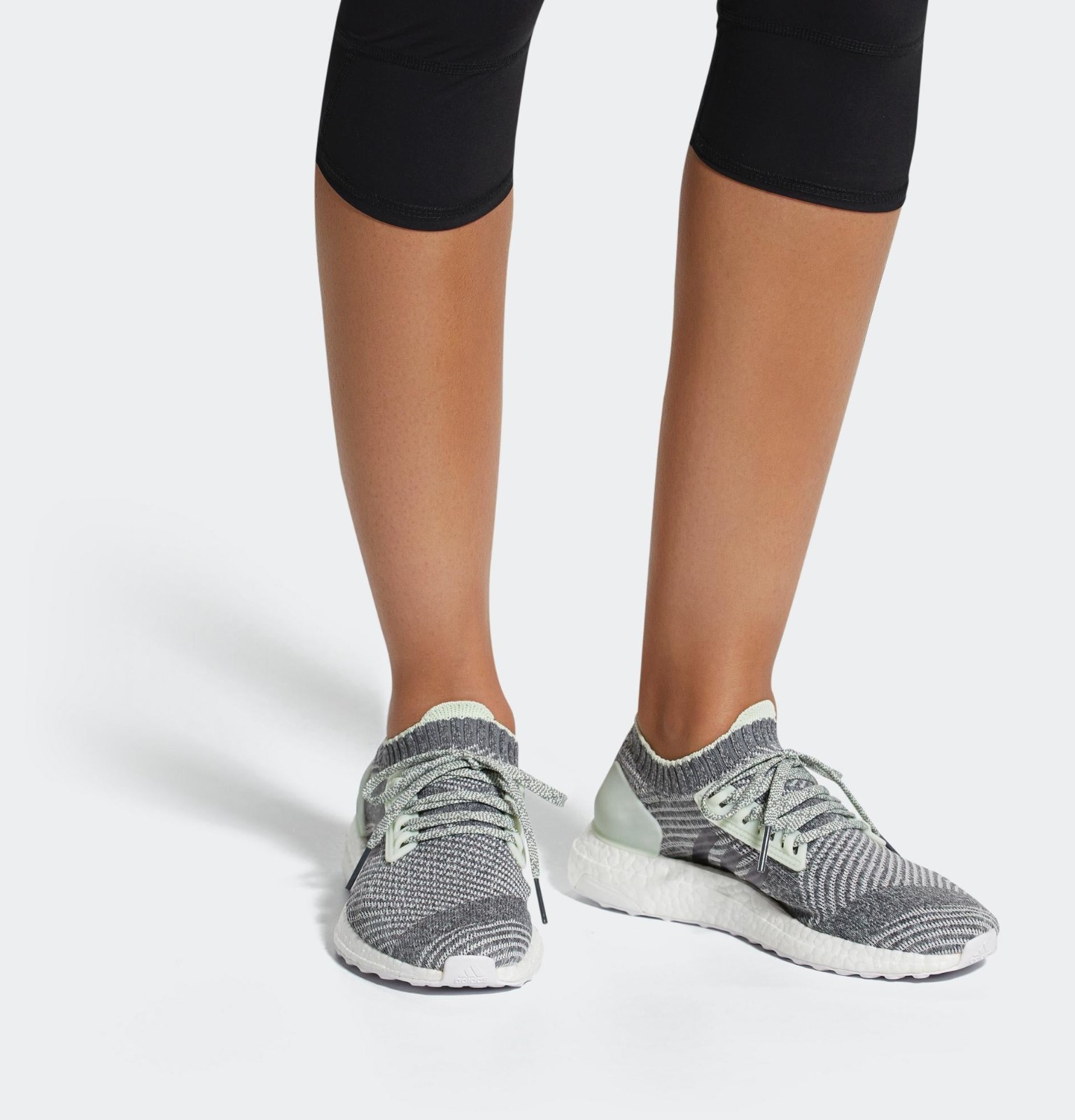 This is a women's running shoe featuring the UltraBOOST X's signature free-floating arch design. The Primeknit upper is primarily dressed in a versatile, muted tone of Grey Three and Shale (a slightly greenish-grey), giving it a minimalist aesthetic. The midsole is the classic exposed white BOOST cushioning, which offers maximum energy return. The key feature is the absence of a traditional midfoot cage; instead, the lacing system is anchored directly to the sole unit, allowing the Primeknit to stretch and hug the foot's arch for a customized fit.