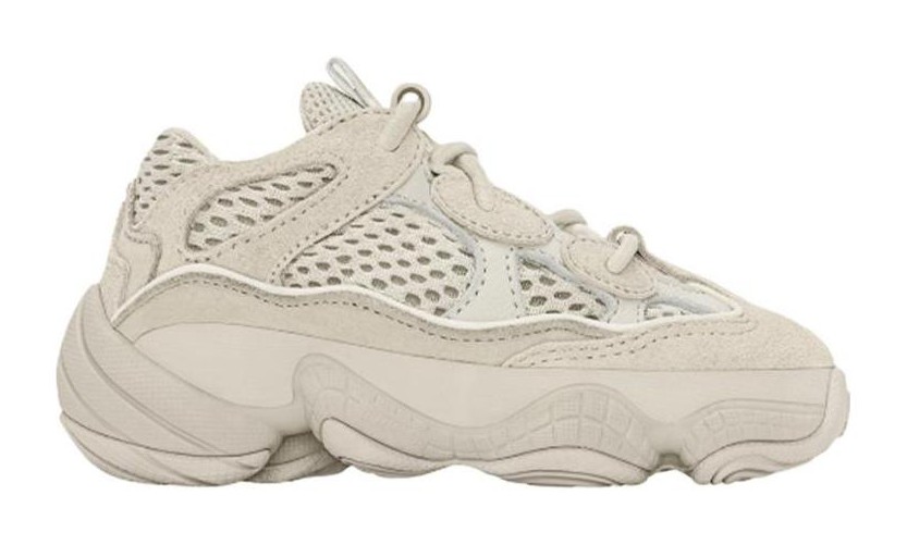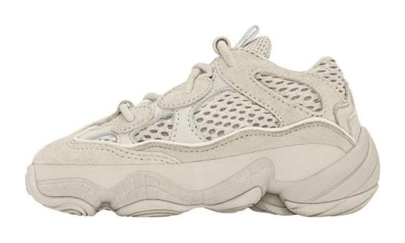 This infant-sized version of the Yeezy 500 features a fully monochromatic "Blush" color, a light, dusty-beige or ivory tone, across its entire upper and sole. The construction uses a mix of suede, leather, and breathable mesh overlays. The shoe has no-tie laces for easy on-and-off and is built on the distinctive, chunky adiPRENE+ cushioned sole, maintaining the adult shoe's aggressive, sculptural look for the smallest feet.