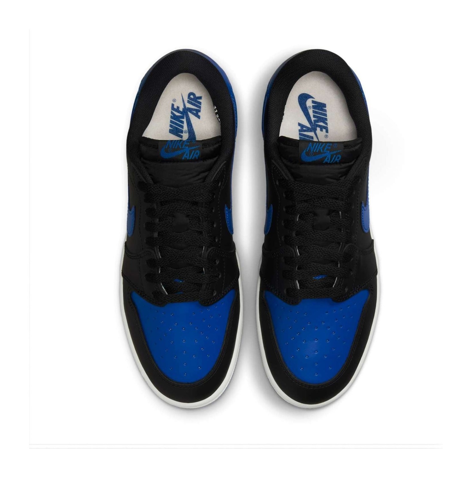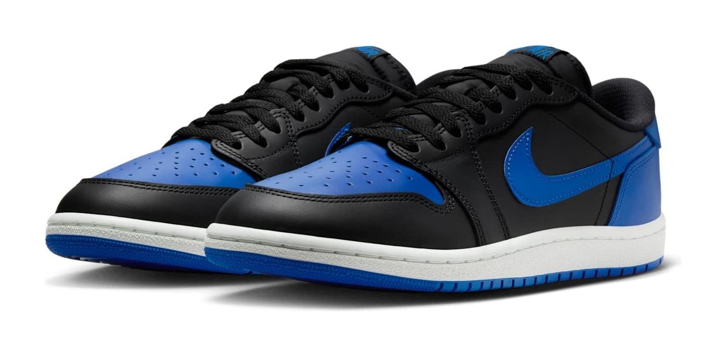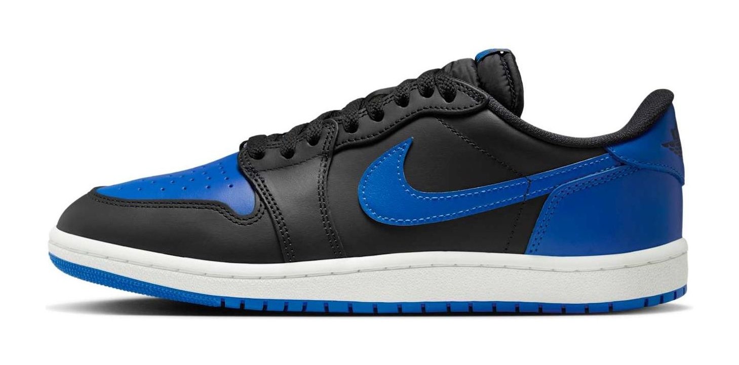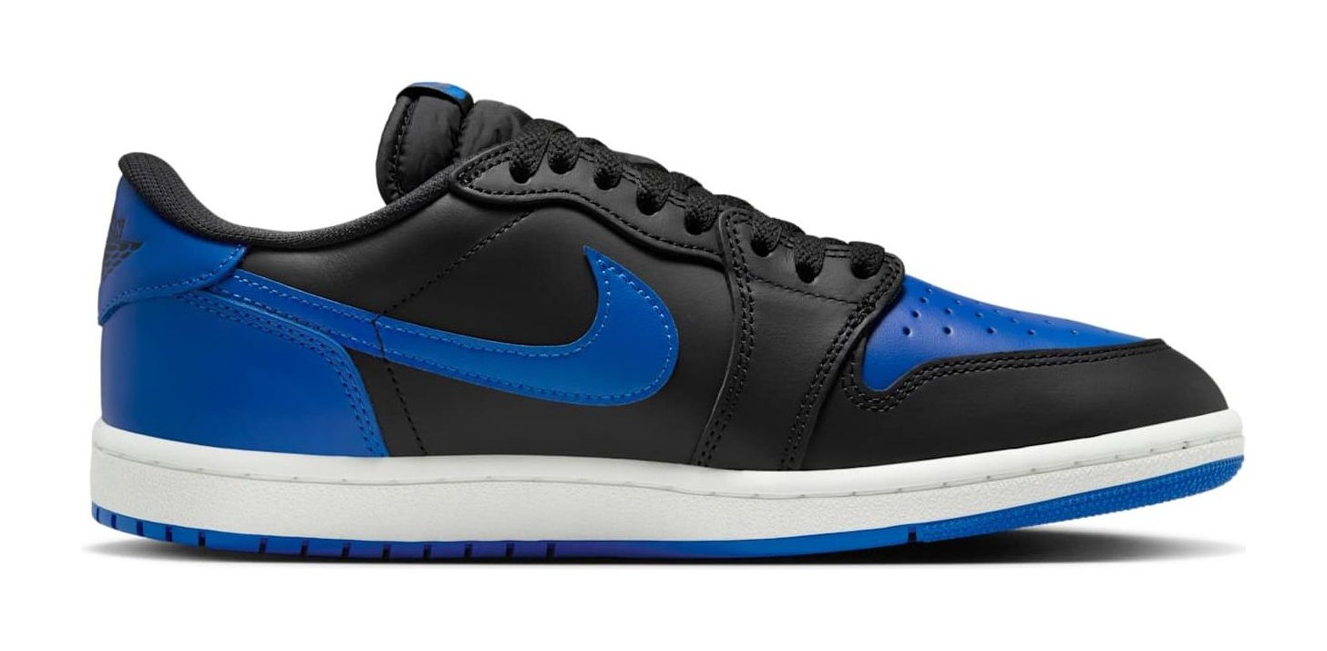 This shoe is a "reimagined" retro release that brings back the authentic 1985 low-top shape and construction. It features the iconic "Royal" color blocking, which is one of the original colors from 1985. The upper is made of premium leather, with a Black base on the side panels, toe cap, and eyestays. Varsity Royal (a vibrant blue) covers the toebox, Swoosh, heel overlay, and outsole. A clean Summit White is used for the midsole to provide classic contrast. Key features include the low-cut, vintage-correct silhouette, the large "Wings" logo debossed on the heel, and the "Nike Air" branding on the tongue, all aiming for a high-fidelity recreation of the 1985 original.