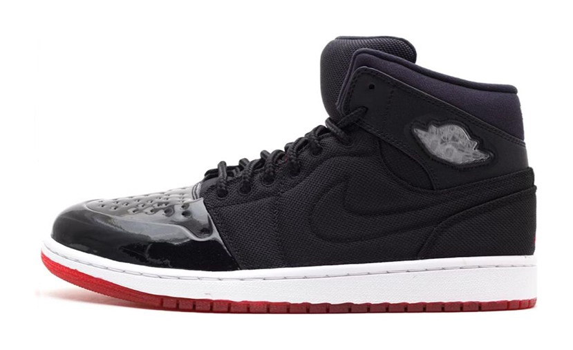 This model is a hybrid design that merges the silhouette of the Air Jordan 1 with signature elements of the legendary Air Jordan 11, specifically in the iconic "Bred" (Black and Red) colorway. The shoe features a Black upper, replacing the typical AJ1 leather with the Black ballistic mesh and patent leather mudguard characteristic of the Air Jordan 11 "Bred." True Red accents are found on the outsole and the Jumpman logo on the tongue and heel. It is built on a white midsole and a red outsole, completing the classic "Bred" look while showcasing the '95 (Air Jordan 11) design cues.