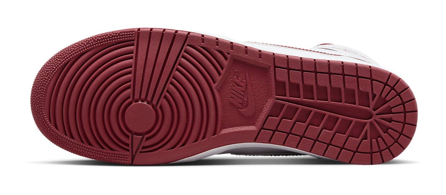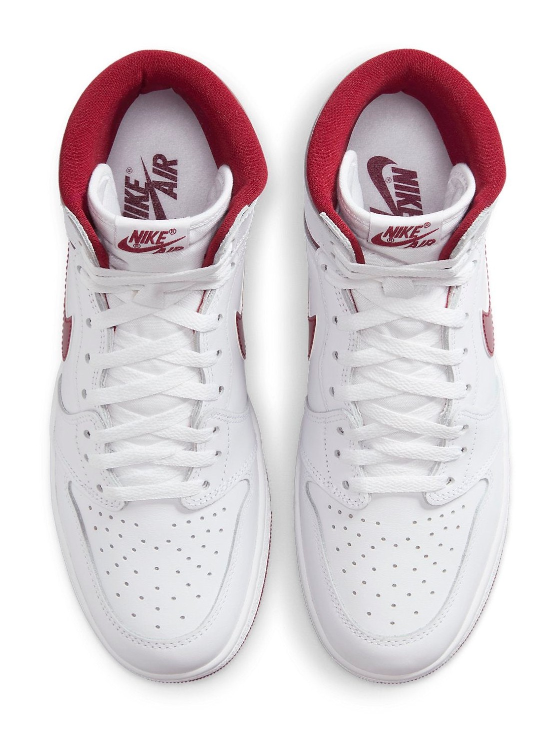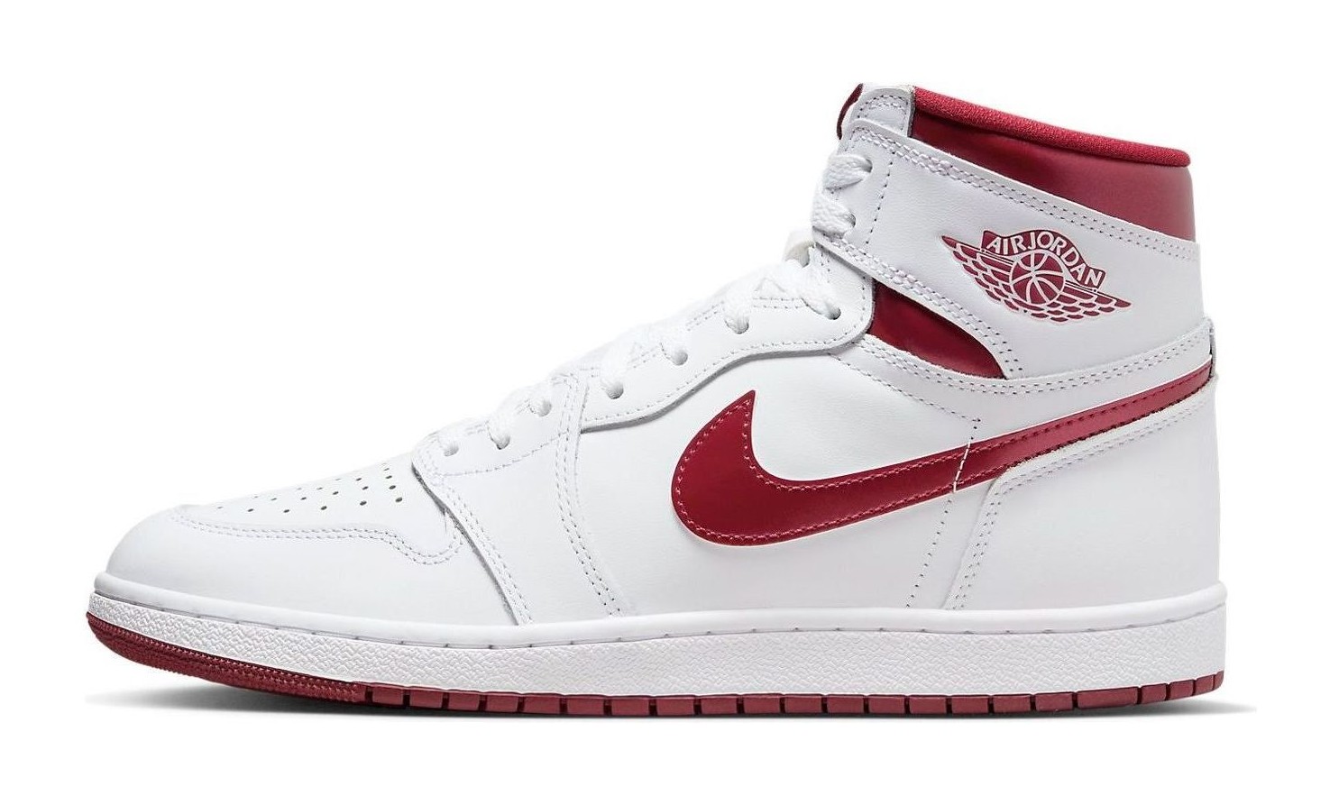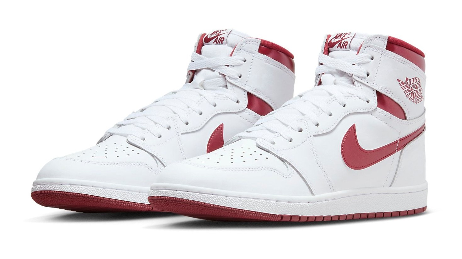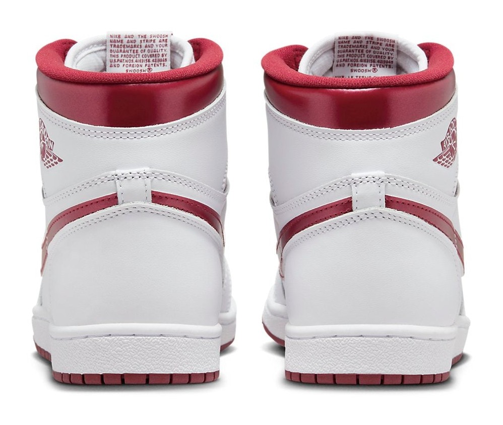 This shoe from the Jordan Brand is a faithful recreation of one of the original "Metallic Pack" colorways from 1986, brought back in the coveted '85 shape, which features a higher collar and a shape closer to the very first Air Jordan 1 release. The shoe has a full-grain white leather upper, providing a clean, classic look. Its distinguishing feature is the metallic sheen on the accents, which are in Team Red (a shade of burgundy). This metallic-like finish is applied to the signature Swoosh logo, the heel collar, and the "Wings" logo stamped on the ankle. The "Nike Air" branding on the tongue tag and the rubber outsole are also rendered in the Team Red color, completing the simple yet striking two-tone design.