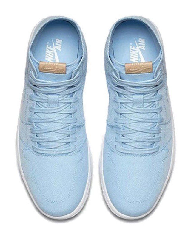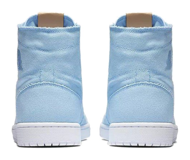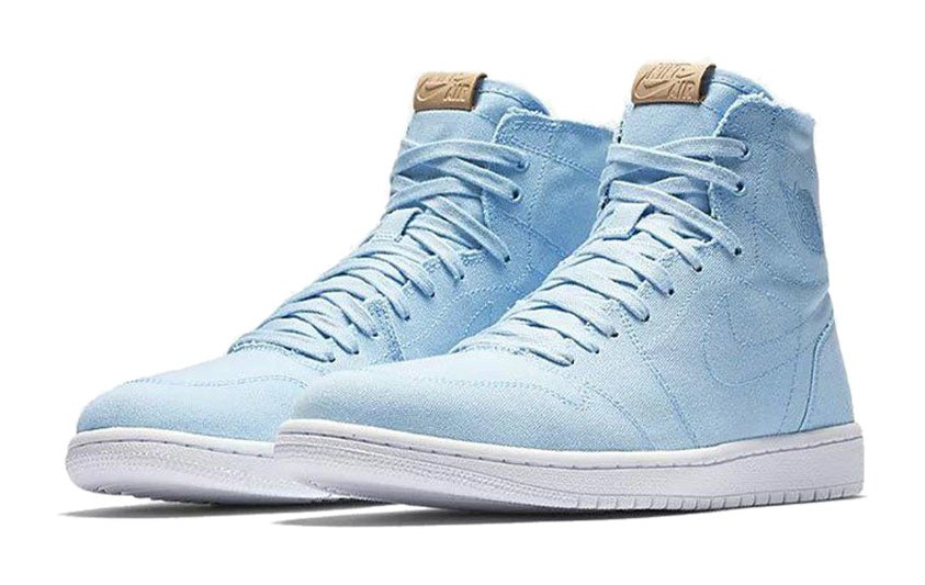 This "Ice Blue" colorway features a monochromatic light blue canvas upper with raw edges and an unlined interior. The Swoosh and panel lines are stitched with contrast thread. The look is completed with a distinctive Vachetta Tan leather tag on the tongue featuring "Nike Air" branding, which is designed to age and darken over time. The entire shoe sits on a clean white sole, offering a simple, minimal, and casual approach to the iconic design.