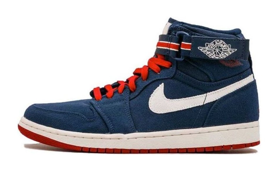 This sneaker is part of the Air Jordan 1 High "Strap" series, which includes a removable ankle strap for adjustable fit and style. The colorway is designed to evoke a "Team USA" or Olympic feel, featuring a Midnight Navy (dark blue) canvas and leather upper with accents of Varsity Red on the Swoosh, "Nike Air" tongue tag, and the Air Jordan "Wings" logo. The midsole is a clean Sail (off-white) color for a vintage look, resting on a navy blue rubber outsole. The inclusion of the prominent navy blue ankle strap is a key feature of this model.
