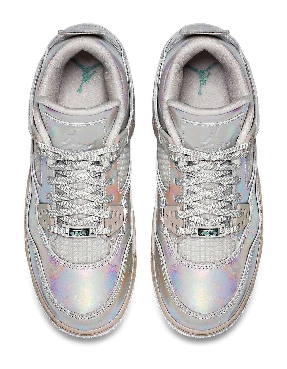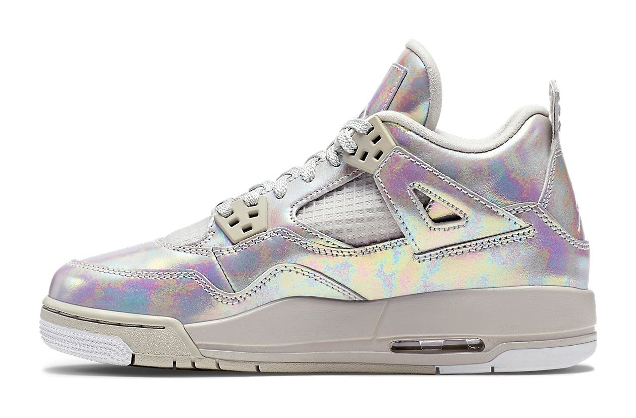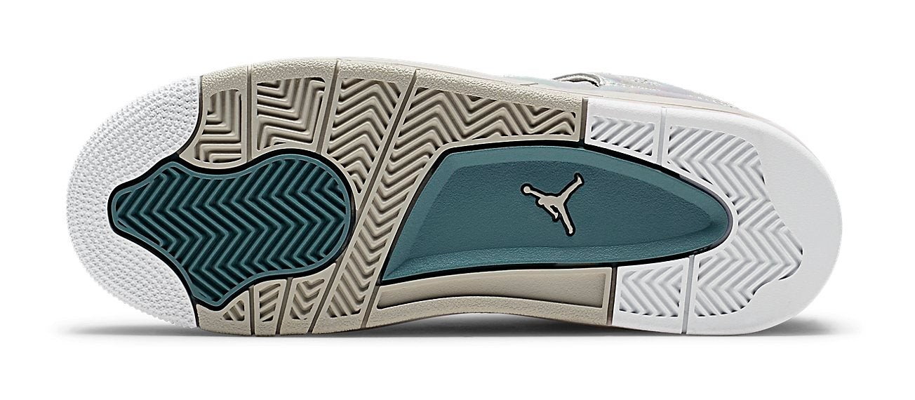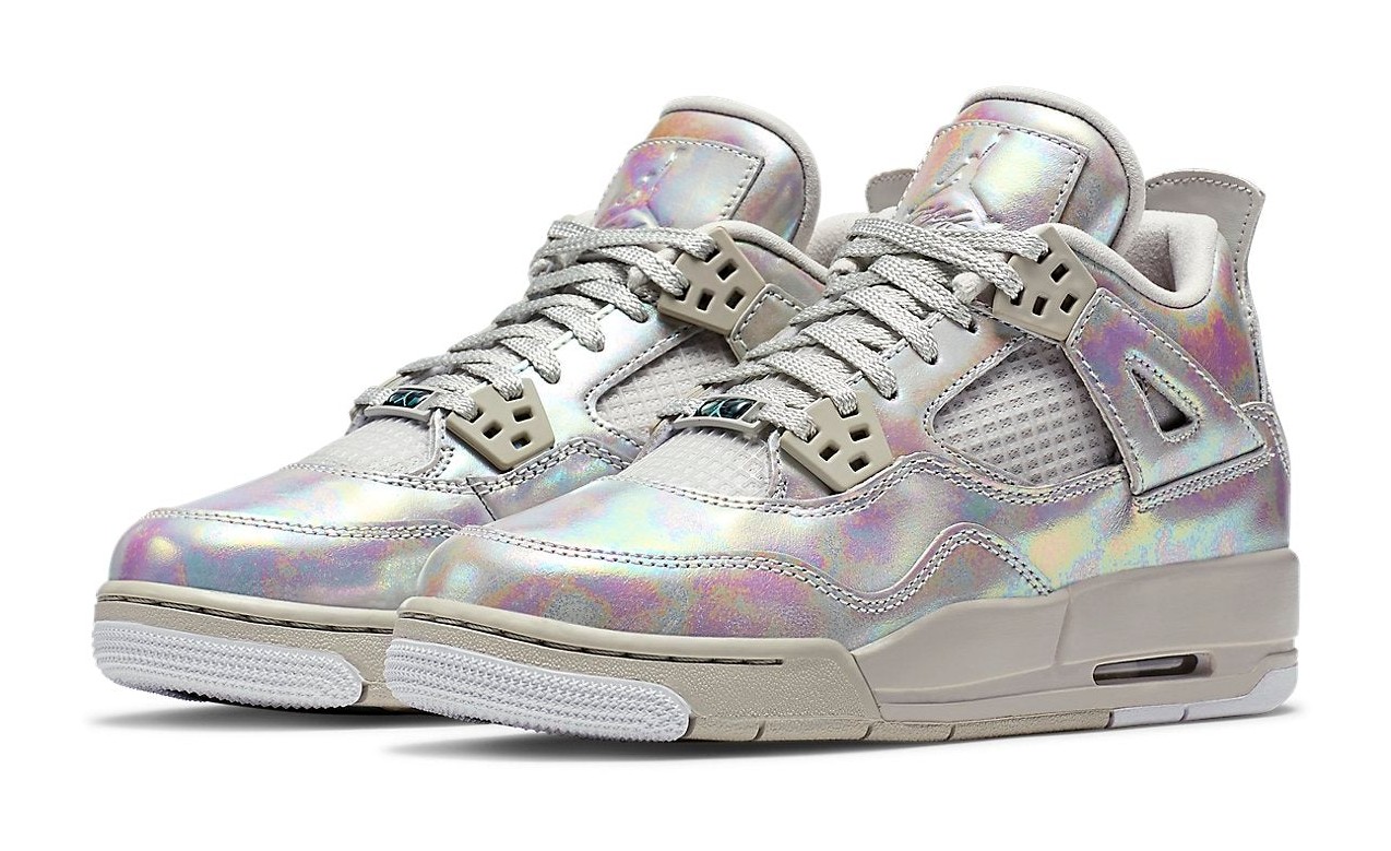 This sneaker was a girls' exclusive release to celebrate the 30th Anniversary of Jordan Brand. It features a predominantly Light Bone upper that is entirely covered in a unique, shimmering, iridescent patent leather finish, designed to evoke the look of a pearl. The tonal design is accented by hits of Cannon (a subtle greenish-blue) and a light grey midsole, completing the luxurious and monochromatic aesthetic.